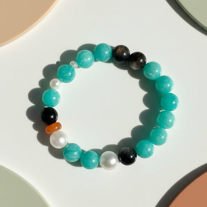 The "Ocean's Heart · Light of Balance" bracelet is designed to be your daily energy companion for stability and harmony. The primary gemstone, serene Amazonite, with its clear blue-green hues, is believed to connect with the throat and heart chakras, facilitating clear communication and emotional healing. In energy practices, Amazonite is known as the "Stone of Hope," soothing anxiety, balancing emotions, and attracting good luck and abundance.