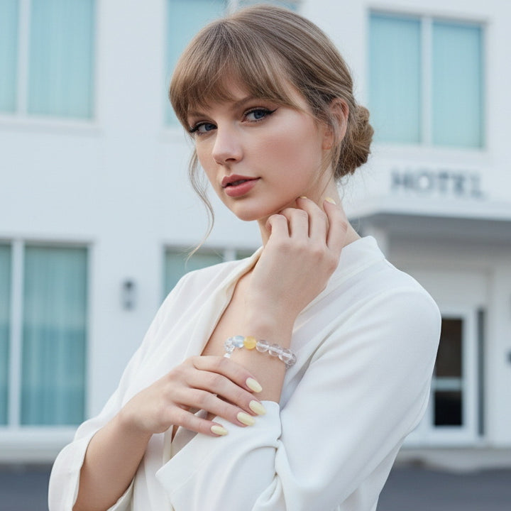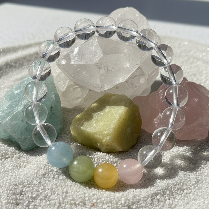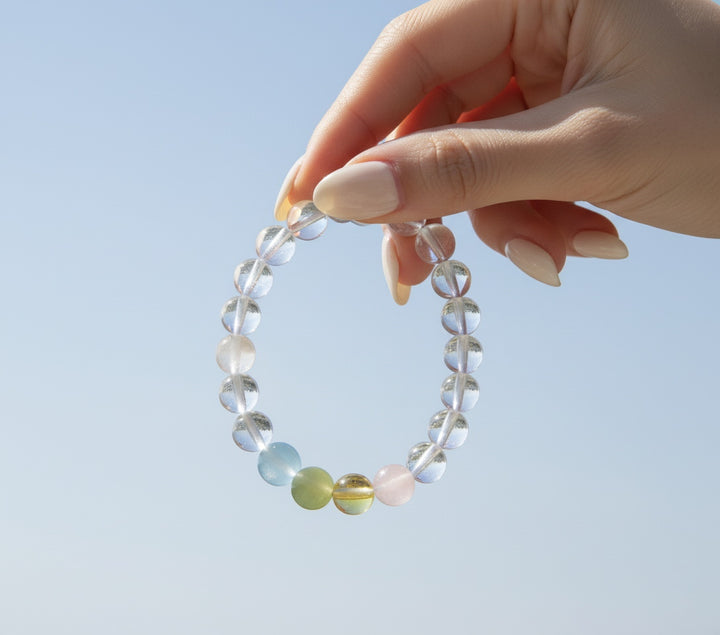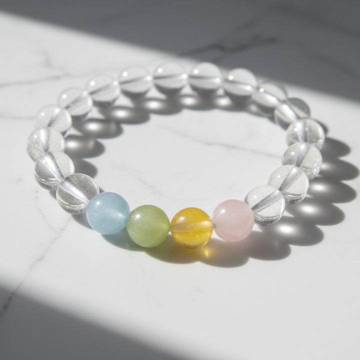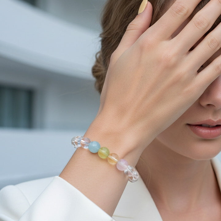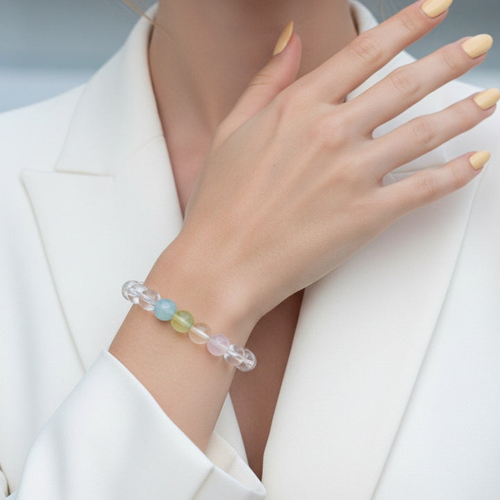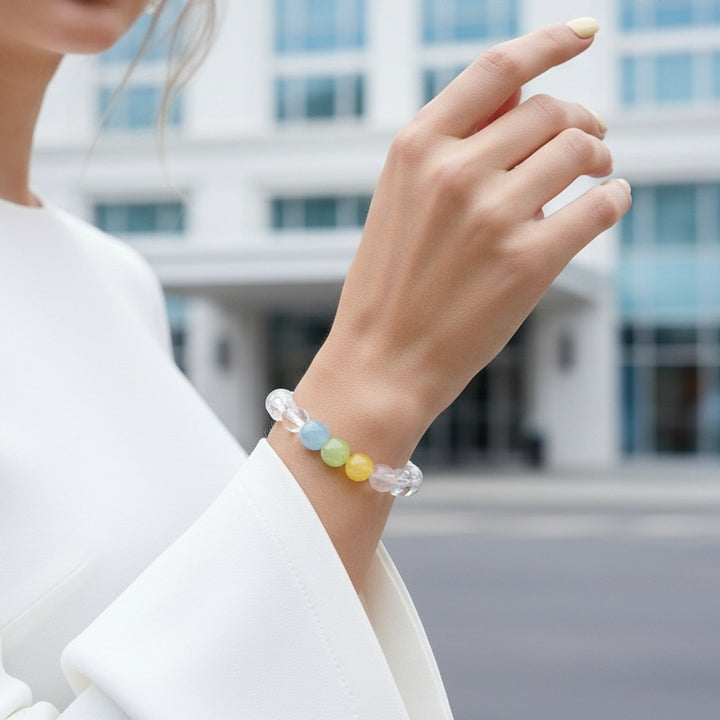 This bracelet is a harmonious symphony of pure energy and color therapy. Its main body consists of clear and flawless natural Clear Quartz beads, known as the "Master Healer" in metaphysics. Clear Quartz is a powerful energy amplifier and cleanser. Wearing it helps to dispel negative energy, enhance mental clarity, and amplify the energy of other gemstones. It assists the wearer in focusing intentions, manifesting desires, and bringing overall balance and vitality.