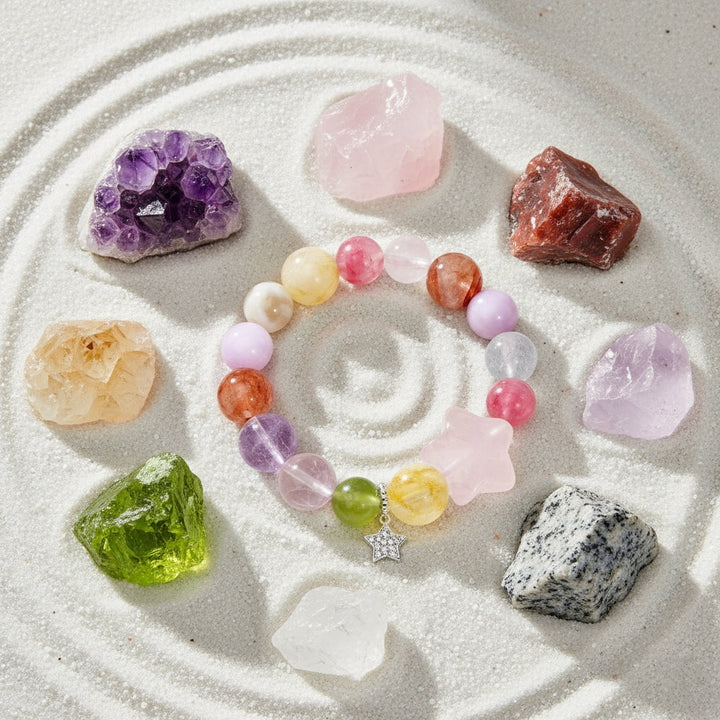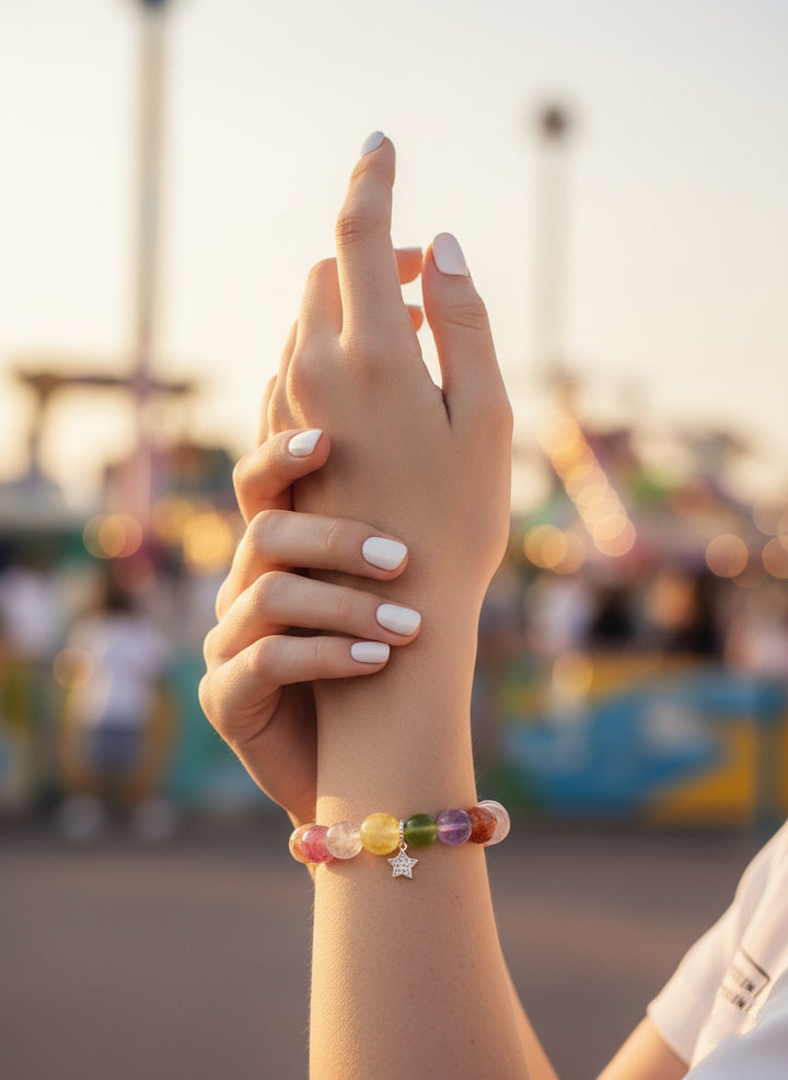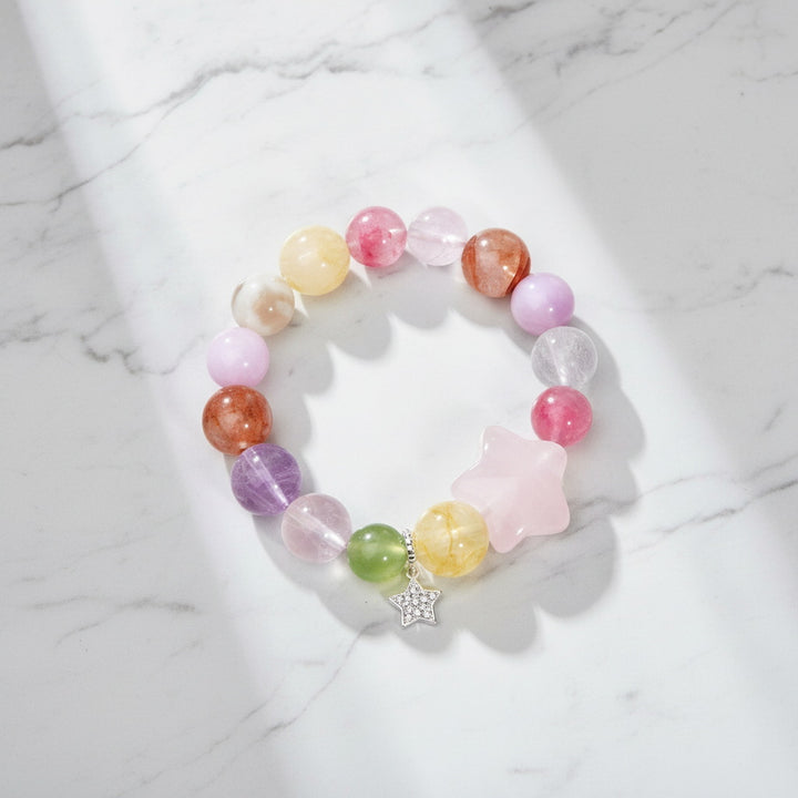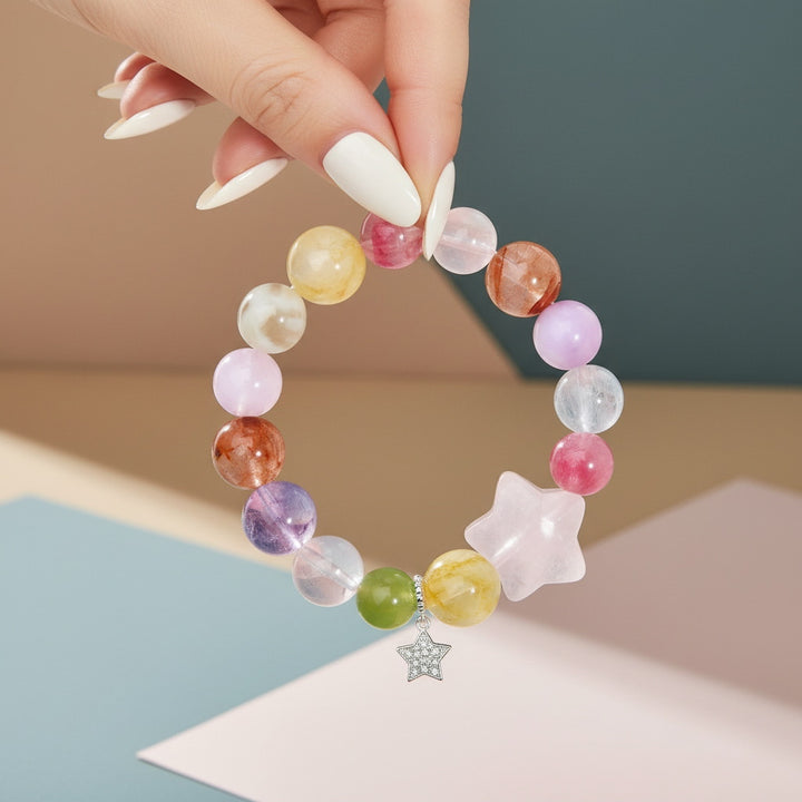 Each bead is meticulously polished, offering a warm touch and captivating luster. The bracelet's design focuses on color harmony and energy flow, creating a unique and striking Colorful Crystals combination. The delicate star charm at the end not only adds a sense of dynamism and charm to the overall piece but also symbolizes hope and guidance, implying that the wearer can find their own light on life's journey.