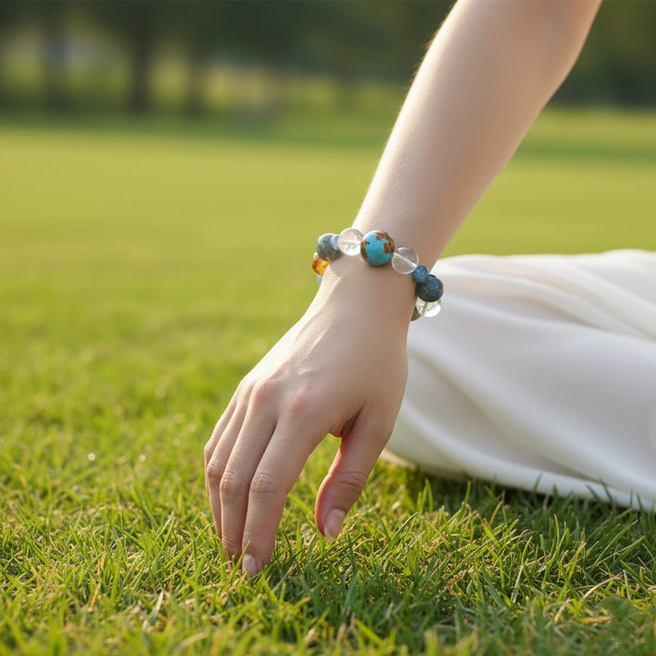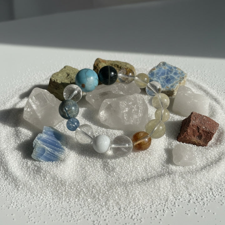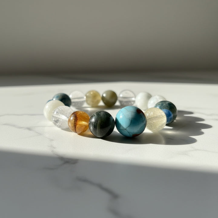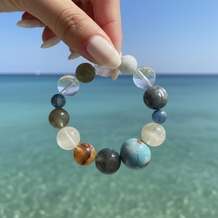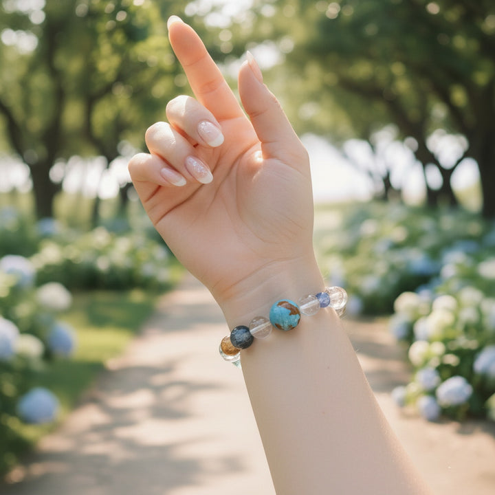 This "Cosmic Energy & Harmonic Light" Multi-Gemstone Bracelet gathers the essence of heaven and earth, making it an ideal companion for seeking balance and elevation in your daily life. We have carefully selected a variety of natural crystals and gemstones, each carrying unique energy frequencies. From the clear quartz bringing purification and focus, to the steady obsidian providing protection and grounding; from vibrant orange-hued gems sparking creativity, to serene blue stones fostering communication and tranquility. Each bead acts like a miniature universe, working synergistically to form a powerful energy field.