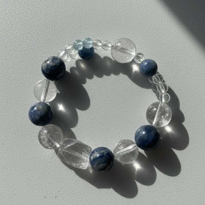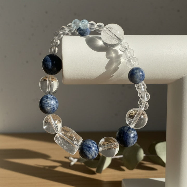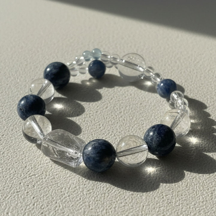 The "Deep Ocean Serenity" energy bracelet draws inspiration from the boundless tranquility and wisdom of the profound ocean. It is not merely an exquisite piece of jewelry but also a bridge connecting your inner peace with outer insight. The design cleverly integrates two powerful natural crystals: the deep blue Sodalite and the crystalline Clear Quartz.