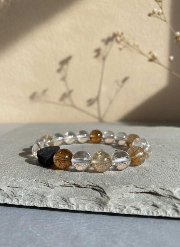 The main body of the bracelet consists of high-quality Clear Quartz beads. Clear Quartz is known in energy work as the "master healer" and possesses powerful properties for purification, amplifying energy, and balancing the chakras. It helps wearers clarify thoughts, enhance focus, and strengthen their connection to universal energy. Complementing the clear quartz, we have carefully interspersed several Rutilated Quartz beads. Rutilated Quartz is considered the "stone of wealth"; its internal golden needle-like inclusions are believed to attract wealth, career success, and good fortune, while also boosting personal confidence and decisiveness, helping wearers maintain courage and determination in the face of challenges.