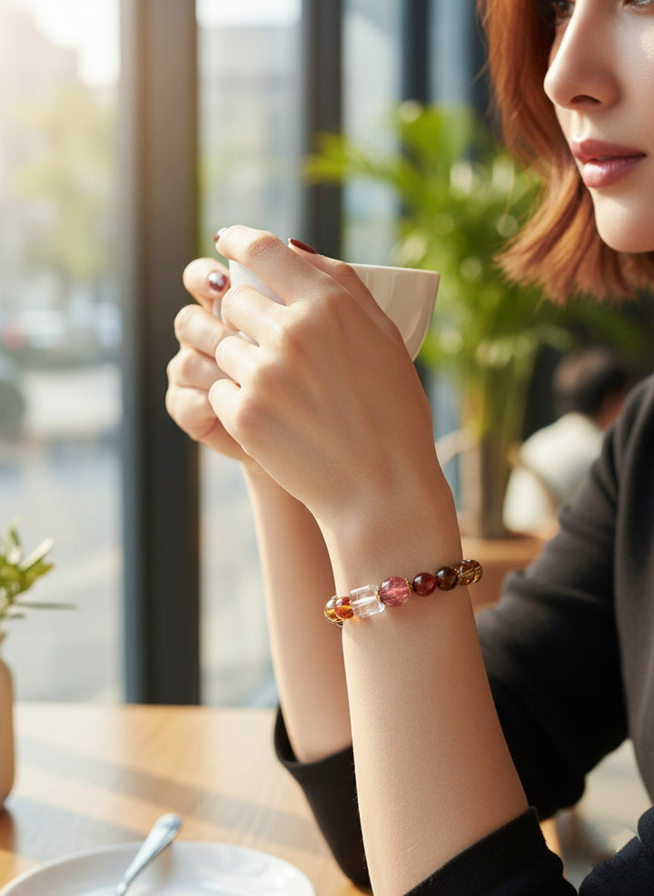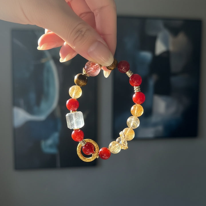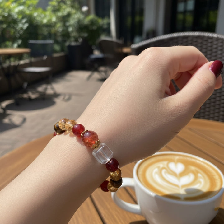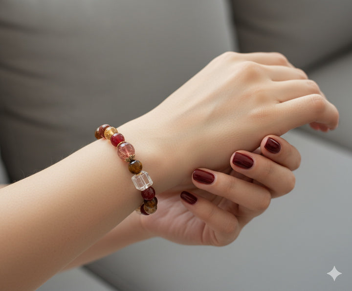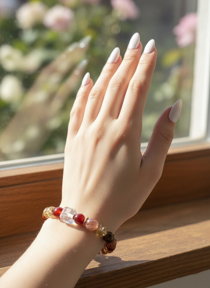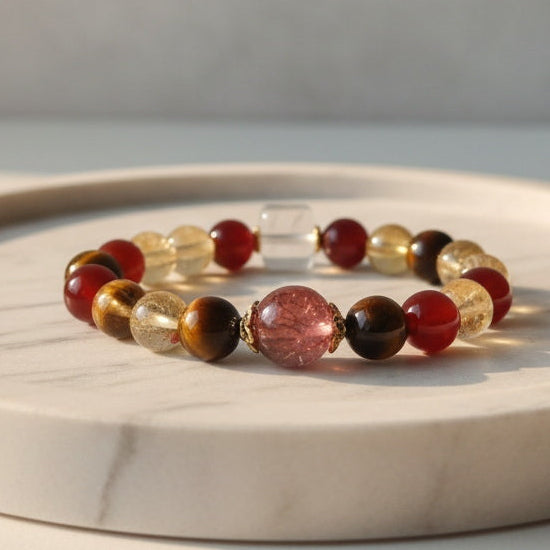 Design Concept: The inspiration for this custom crystal bracelet comes from the colors and energy cycles of nature. We have selected various gemstone jewelry materials, each possessing unique healing properties, aiming to bring comprehensive positive influences to the wearer through the interplay of colors and synergistic energies. Visually, the warm Garnet symbolizes vitality, the golden Tiger's Eye and Citrine represent wealth and power, while the gentle Strawberry Quartz brings love and good luck, creating a harmonious and layered visual feast.