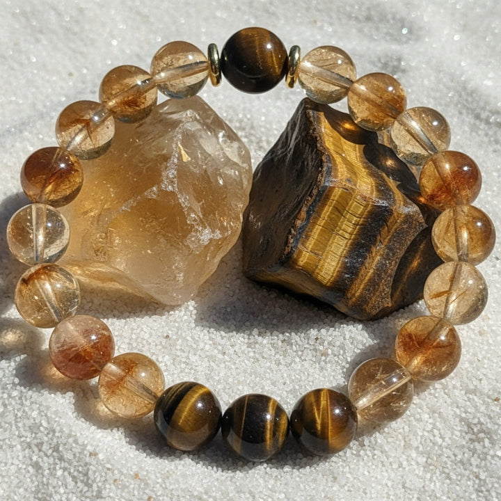 Golden Rutilated Quartz & Tiger's Eye Bracelet - Natural Crystal Energy Healing Bracelet for Wealth, Protection & Career