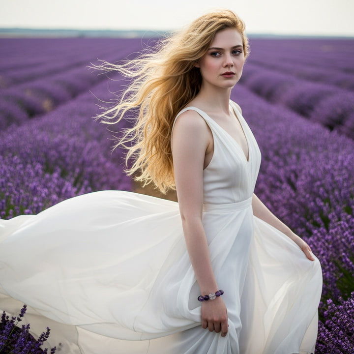 The gradient color scheme of the bracelet is its most striking feature. The beads gradually transition from a light, clear lavender to a rich, deep purple, cleverly interspersed with clear white crystal, creating a fluid and harmonious aesthetic. This design not only enhances the bracelet's fashion appeal but also symbolizes personal growth and energetic transformation.