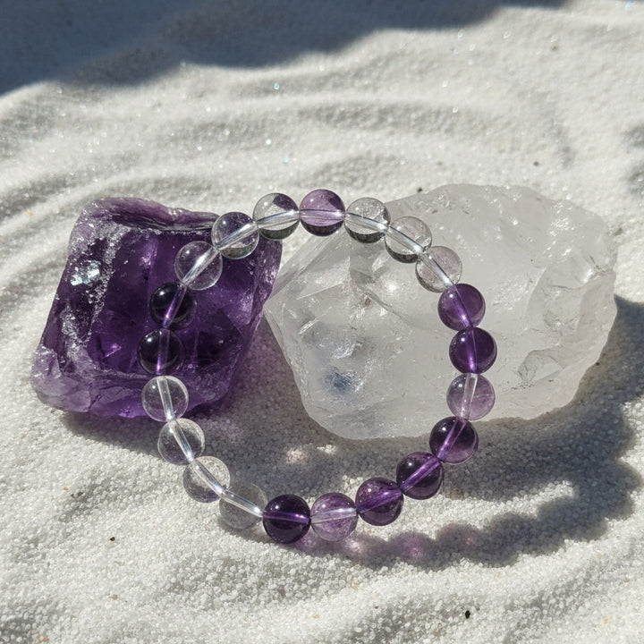 The bracelet features a selection of high-quality gradient amethyst beads, ranging from light to dark in color, each radiating unique charm. These light and dark amethyst beads are carefully arranged to form a smooth, natural color transition, like a mesmerizing sunset sky. Interspersed are several pure and flawless white crystal bracelet beads, which not only visually brighten the overall design but also play a powerful role in energetic purification and amplification, ensuring the purple crystal's energy is pure and stable. Each bead is meticulously polished for comfortable wear and a warm, smooth touch. We use a sturdy and durable elastic cord, suitable for various wrist sizes, guaranteeing secure wear, making it an ideal fashion bracelet.