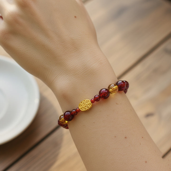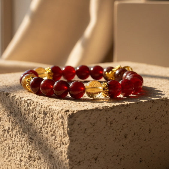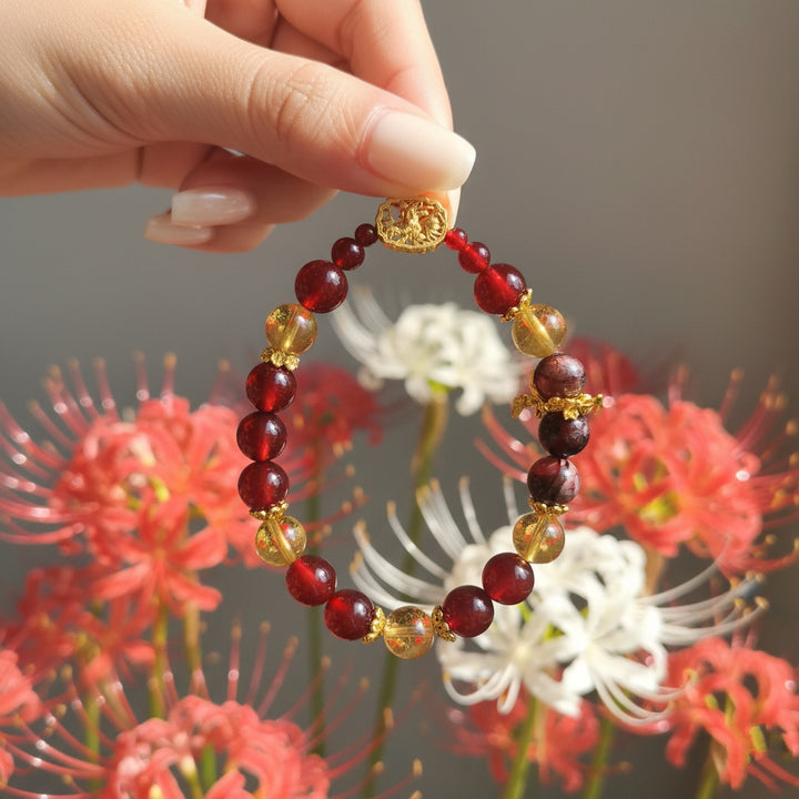 Contrasting with and mutually enhancing the fiery energy of Red Agate are the interspersed Golden Rutilated Quartz bracelet beads. Golden Rutilated Quartz is renowned for its unique and rare golden hair-like inclusions, which are considered symbols of wealth and good fortune. They shimmer with a captivating golden glow under light, signifying the accumulation of wealth and prosperity in one's career. We use high-quality Golden Rutilated Quartz, ensuring clear and beautifully distributed inclusions to maximize its wealth-attracting energy.