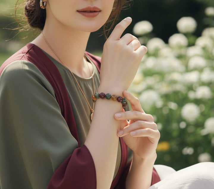 The "Multicolor Phantom Quartz Crystal Bracelet" is more than just an ornament; it's a miniature energy garden, embodying the mysteries of nature and the wisdom of the universe. The bracelet is meticulously strung with beads of various colored Phantom Quartz, each seemingly encapsulating the slow growth of minerals over millions of years, forming unique "phantom" structures that display rich layers of green, brown, orange, red, and other hues. These distinctive inclusions are regarded in energy metaphysics as the crystal's "memory" and "wisdom."