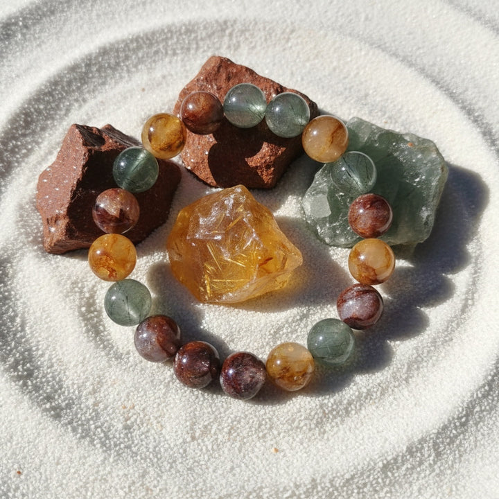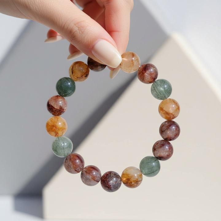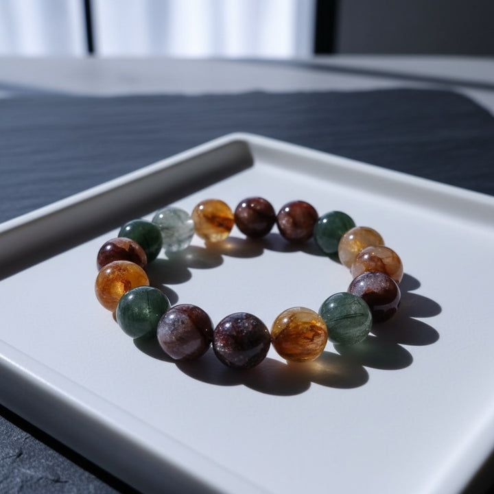 Discover our meticulously crafted Multicolor Phantom Quartz Crystal Bracelet, a unique piece that perfectly blends natural beauty with metaphysical energy. We've hand-selected high-quality natural Phantom Quartz beads, each one unique, containing mineral inclusions of various colors and forms that create captivating "phantom" effects. The colors of these Phantom Quartz span mysterious greens, warm oranges, serene browns, and fiery reds. Intertwined, they not only lend the bracelet rich visual depth but also combine multiple benefits for energy balance.