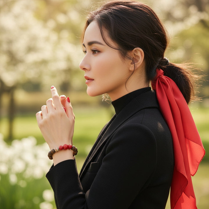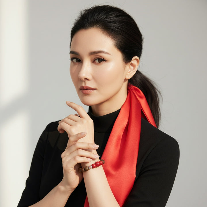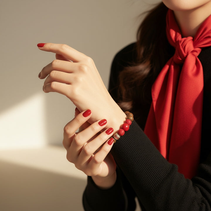 To enhance the bracelet's function as a wealth charm and lucky jewelry, we have cleverly incorporated several vibrantly colored cinnabar beads. Cinnabar holds immense symbolic significance in Chinese Daoist culture, being a supreme item for exorcism and home protection, renowned for its powerful pure Yang energy. Its inclusion not only adds a striking pop of color to the overall design but also energetically bestows the wearer with powerful protection, guarding against misfortune, and attracting positive energy to aid career development and financial prosperity. The "cinnabar red" also symbolizes sincerity and purity, helping the wearer maintain inner integrity.