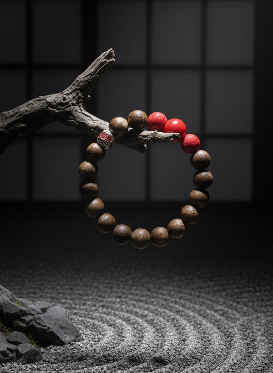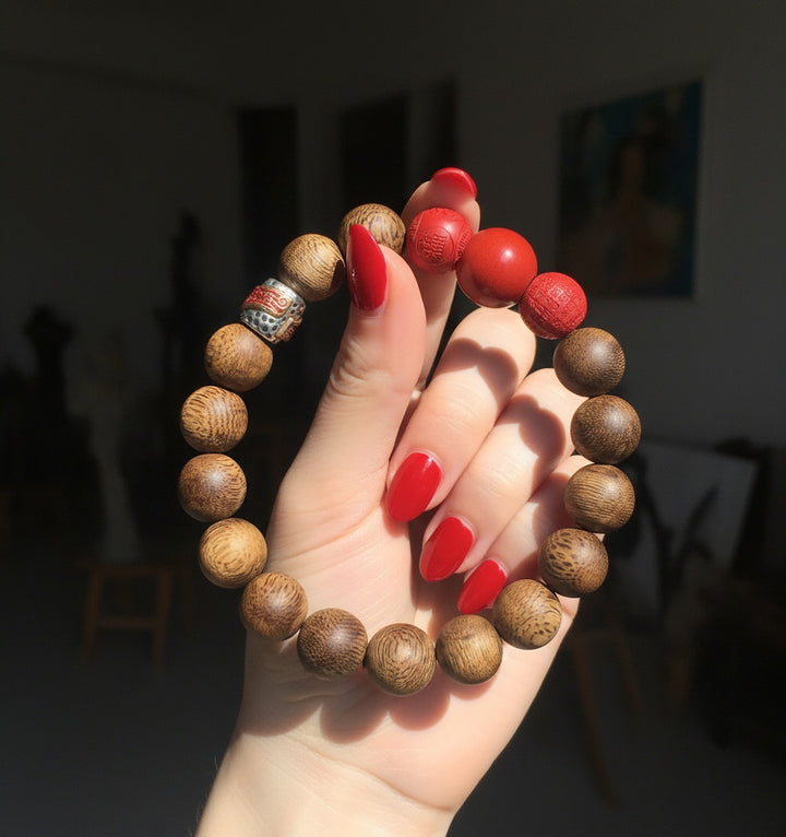 This bracelet is more than just an accessory; it's a vessel imbued with ancient Daoist wisdom and natural energy. We name it "Mystical Wood & Cinnabar Heart," symbolizing the profound tranquility of agarwood combined with the powerful exorcising force of cinnabar, signifying potent protection, inner peace, and prosperity.