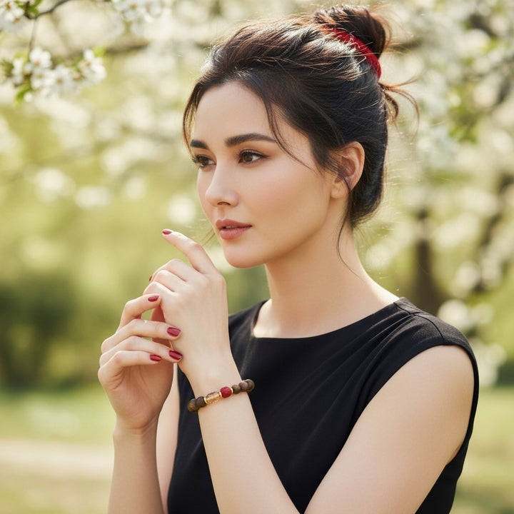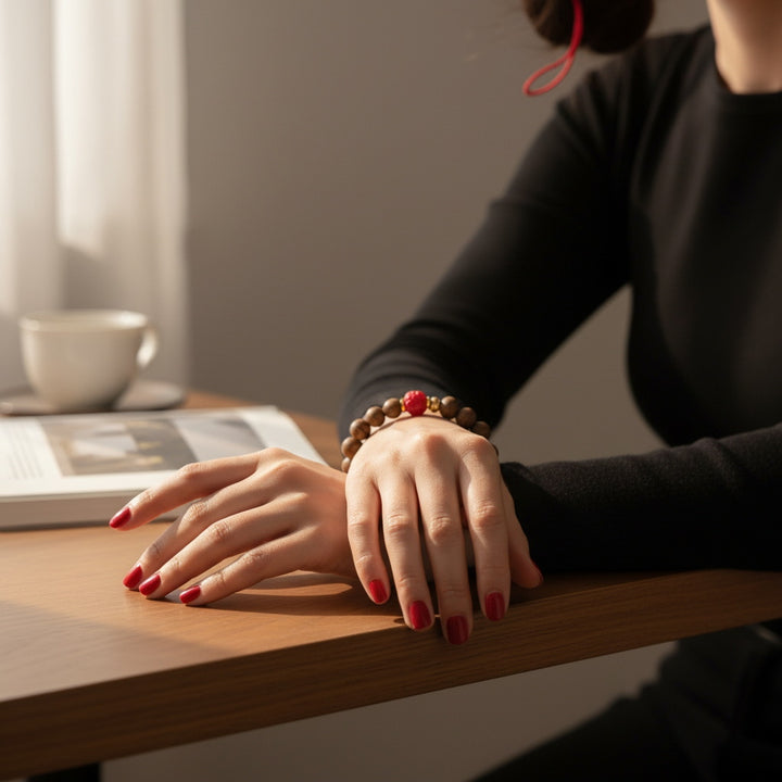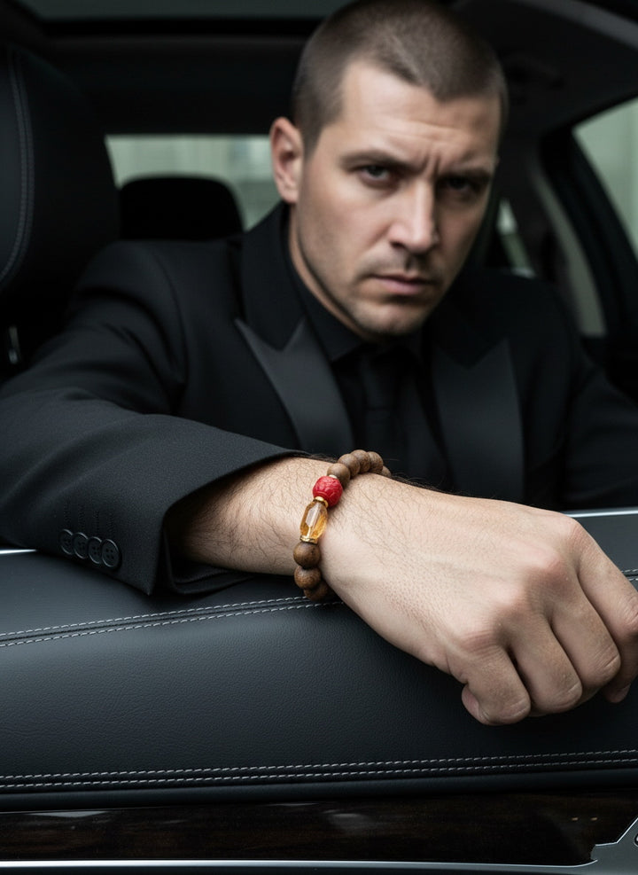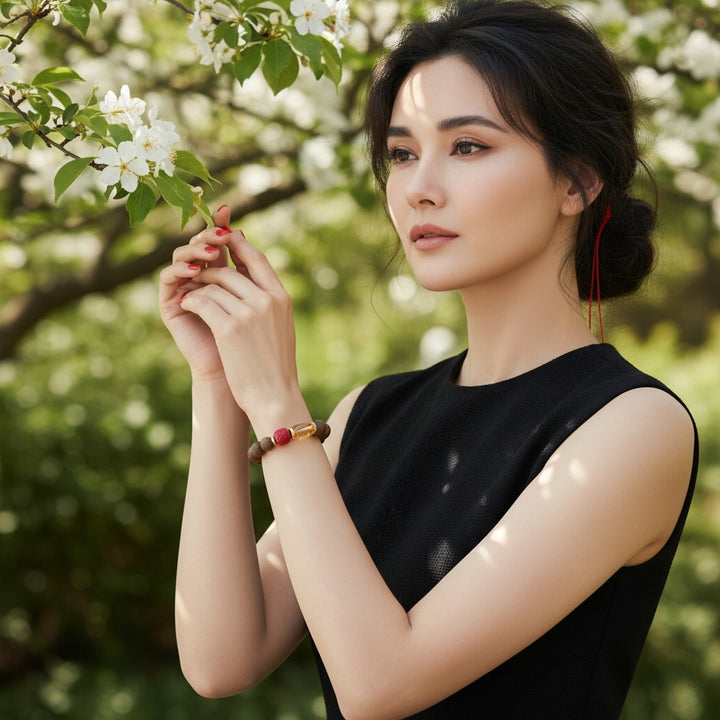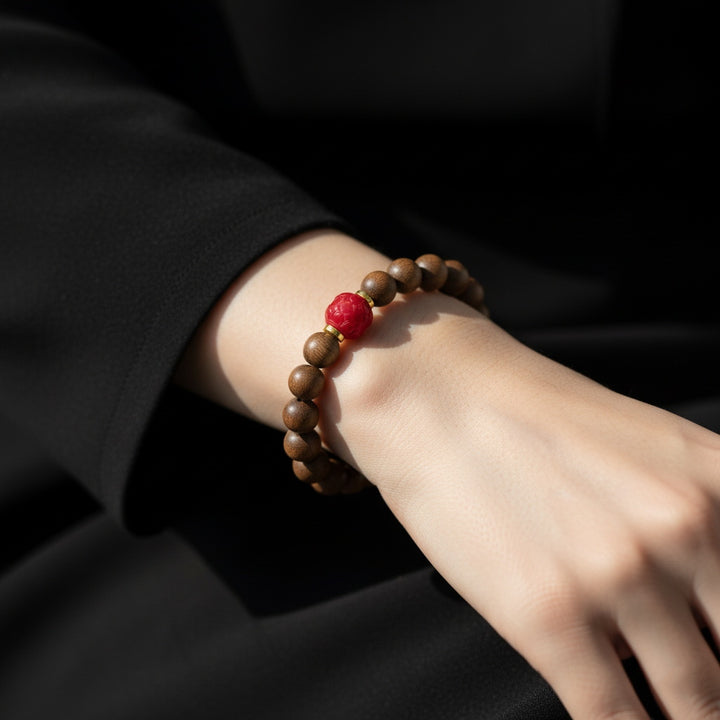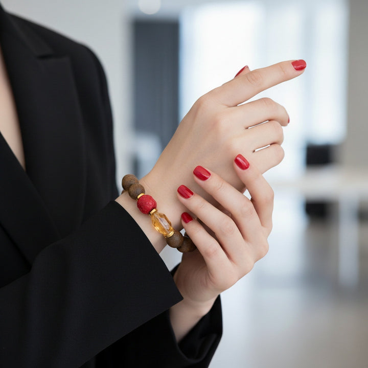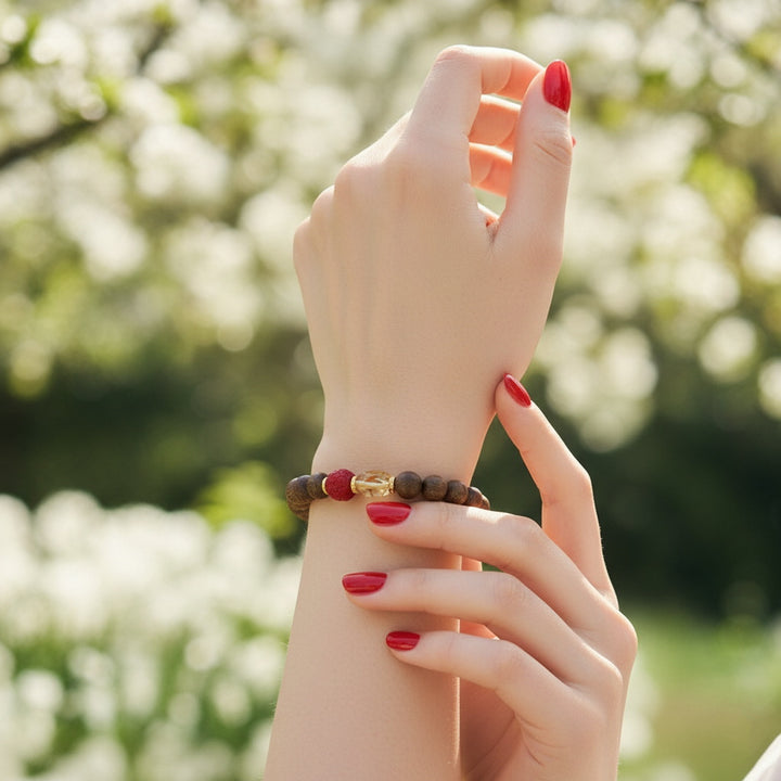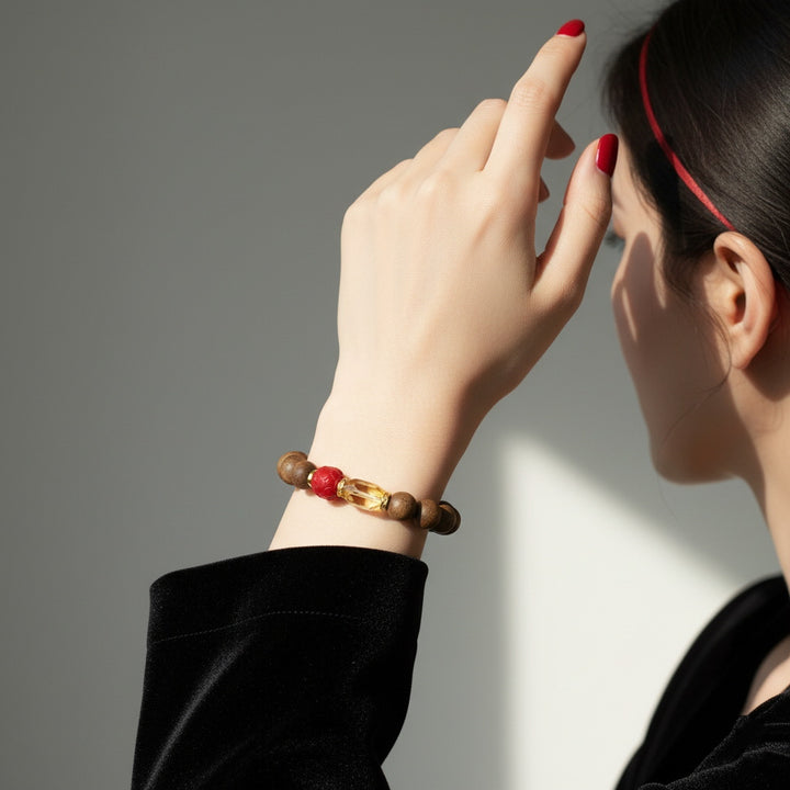 The core of the bracelet is strung with carefully chosen natural Agarwood prayer beads, each meticulously polished to ensure a warm and comfortable touch. At the center of the bracelet, we ingeniously embedded a richly colored, exquisitely carved Cinnabar bead. Its vibrant red color in traditional Chinese culture symbolizes ultimate evil-warding and luck transformation powers. Adjacent to the Cinnabar is a crystal-clear Citrine, gleaming with golden light. It is not only a symbol of wealth and wisdom but also adds a touch of nobility and vibrancy to the entire bracelet with its unique warm luster.
