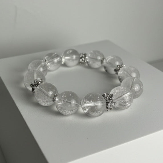 Design Concept: The bracelet is strung with smooth, full Clear Quartz beads, symbolizing completeness and infinite循环 (endless cycle) of energy. The intricately spaced silver (or alloy) ornaments not only add to the design but also signify the gathering and release of energy, making the overall design both aesthetically pleasing and powerful. Wearing it is like carrying a mini energy station, constantly infusing you with light and vitality.