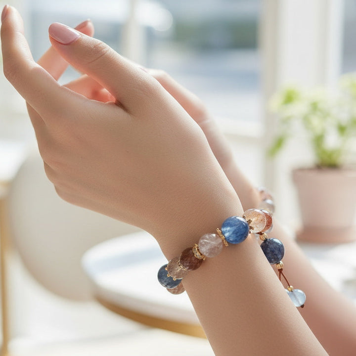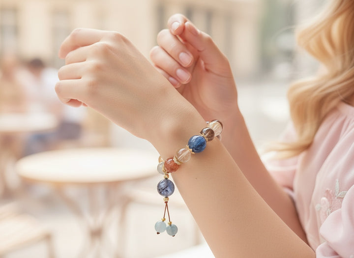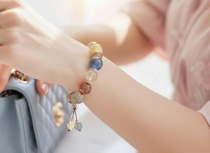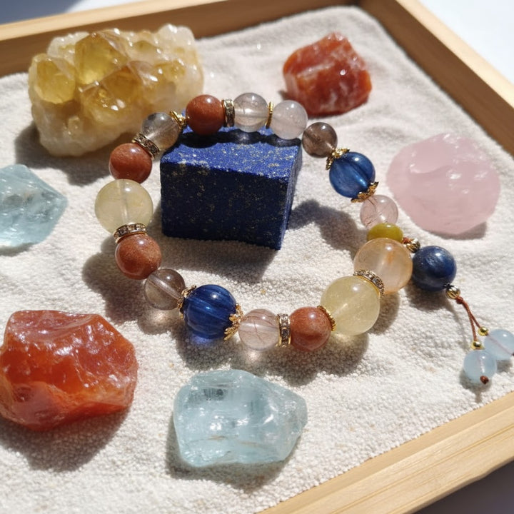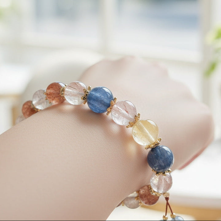 Design Philosophy: We believe every natural crystal holds unique cosmic frequencies. The design inspiration for this multi-gemstone bracelet comes from the harmony and balance of the universe. We cleverly blend the wealth-attracting energy of Citrine and Golden Rutilated Quartz with the love magnetism of Strawberry Quartz and Rose Quartz, complemented by the peaceful wisdom of Aquamarine and the protective power of Smoky Quartz. The exquisite embellishments interspersed throughout not only enhance its overall fashionable appeal but also symbolize the convergence and transformation of energy.