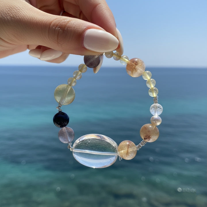This bracelet features a carefully selected natural clear crystal as its focal stone, renowned for its exceptional purifying crystal abilities and its capacity to amplify the crystal energy of other stones. It is complemented by gleaming golden rutilated quartz bracelet beads, symbolizing prosperity and good fortune, serving as a powerful tool for wealth attraction. Gentle amethyst bracelet beads bring emotional balance and spiritual awakening, making it ideal as a meditation tool or daily spiritual jewelry. The steadfast black obsidian bracelet acts as a potent amulet, offering protection and effectively blocking negative energies. Elegant pearl bracelet beads interspersed throughout add a touch of purity and harmony.