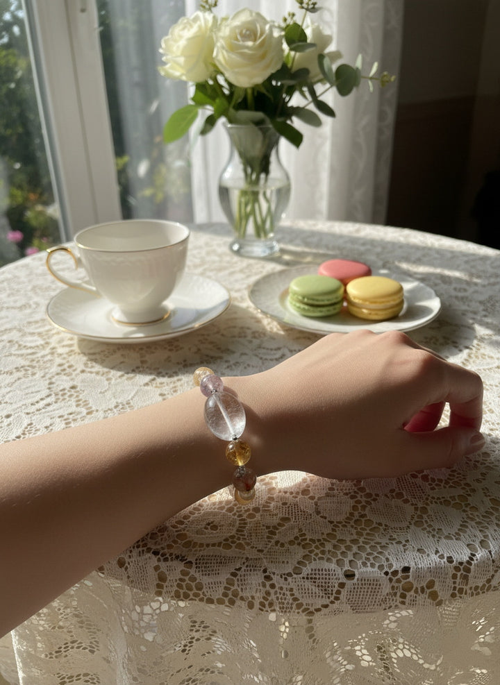 The overall design philosophy is to create a flowing energetic cycle, with the clear crystal as the core, merging, amplifying, and transmitting the energies of the different colored crystals. Whether seeking spiritual peace, enhancing career luck, or boosting personal aura, this "Confluence of Light" bracelet will be a powerful energy companion in your daily life. It is not just a beautiful accessory but a personalized energetic talisman designed to help you maintain balance, attract abundance, and experience joy in your daily life.