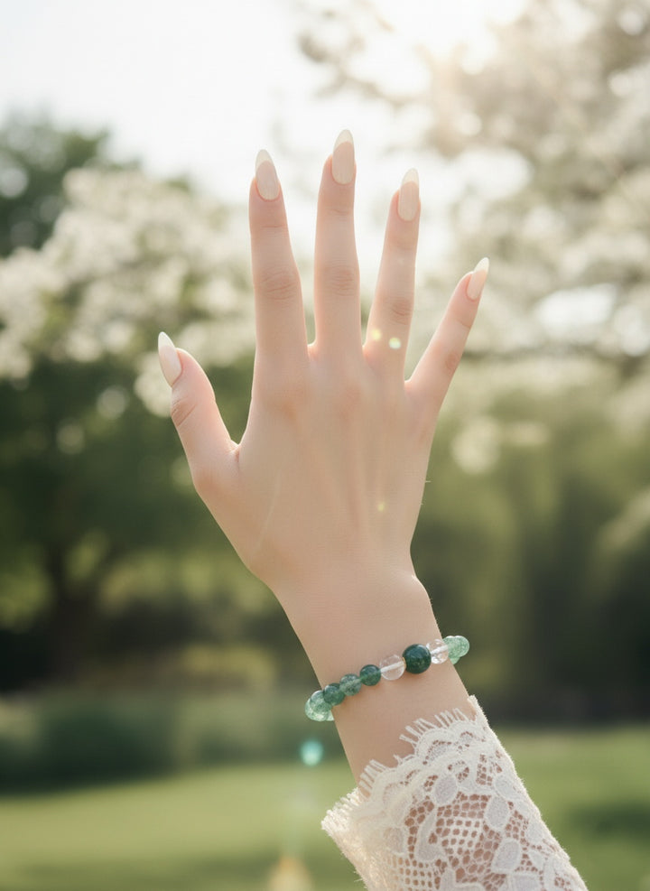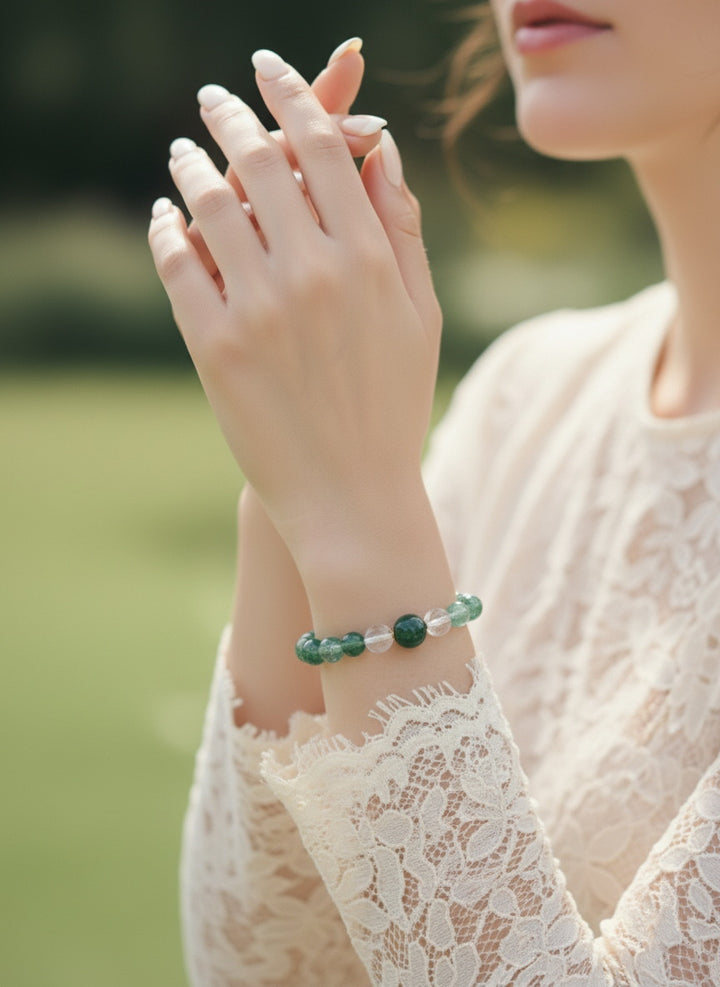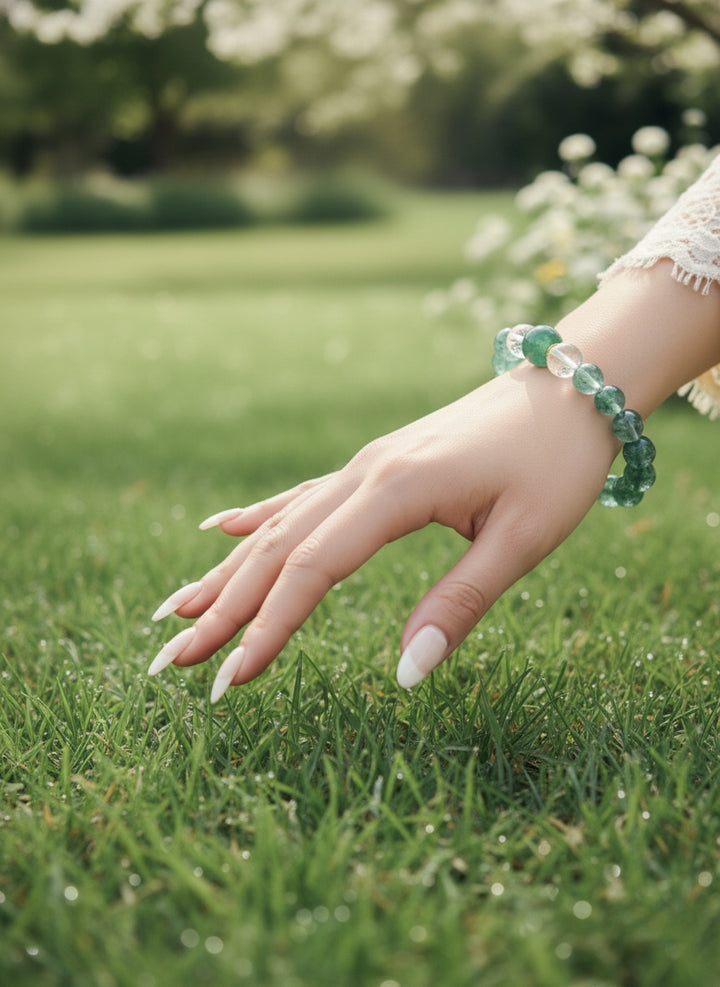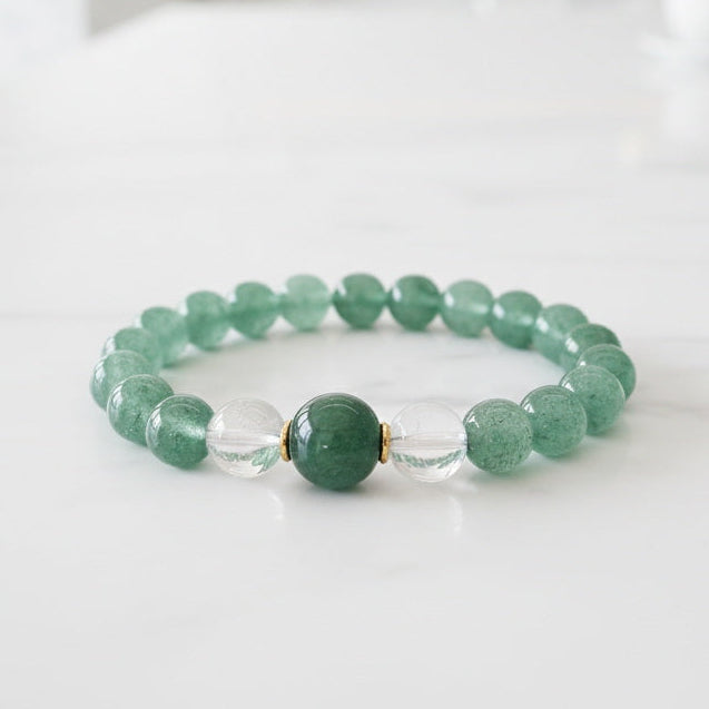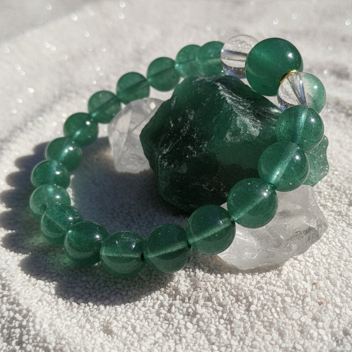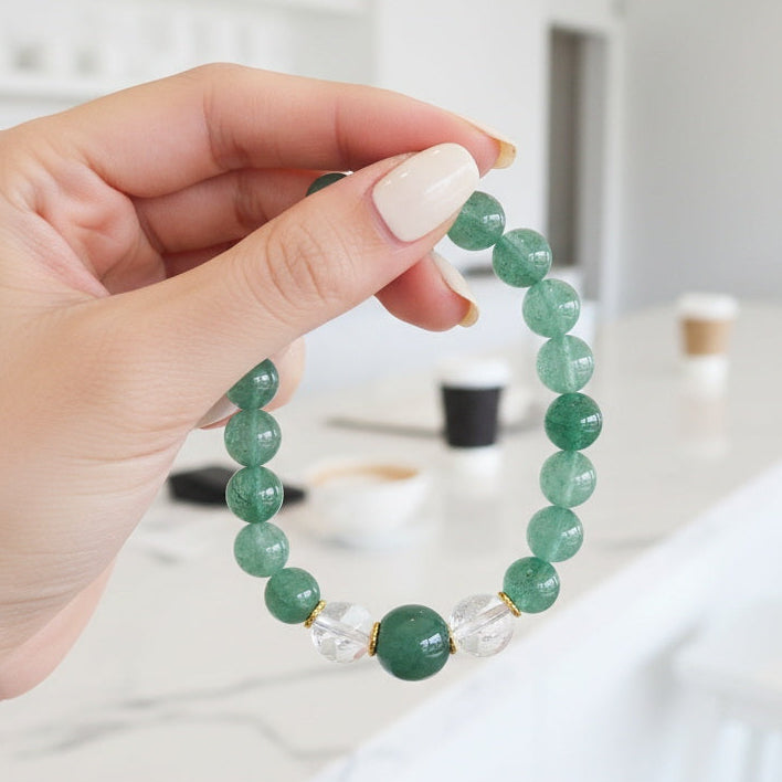This bracelet is themed "Vibrant Radiance of Love and Abundance," combining the unique energy of Green Strawberry Quartz with the harmonious power of pure Clear Quartz.