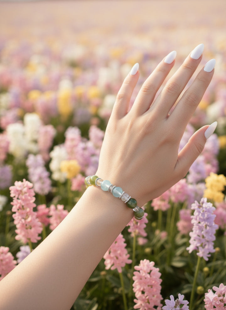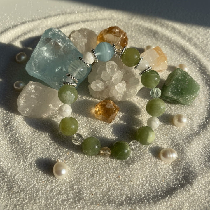 In its overall design, the vitality of Green Tourmaline, the tranquility of Aquamarine, and the softness of Pearl are perfectly blended, forming a powerful energy field. Wearers will experience an inner balance and harmony. Whether seeking emotional relief, smoother communication, or wishing to enhance personal life energy and attraction, this bracelet will be your ideal companion, helping you maintain positive energy and attract good fortune in daily life.