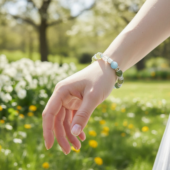 This Natural Crystal Bracelet is a meticulously crafted masterpiece, perfectly blending the vibrant life force of Green Tourmaline Bracelet, the serene wisdom of Aquamarine Bracelet, and the gentle elegance of Pearl Jewelry. Inspired by the profound energies bestowed upon us by nature, its design aims to bring harmony and enhancement to the wearer's mind, body, and spirit.