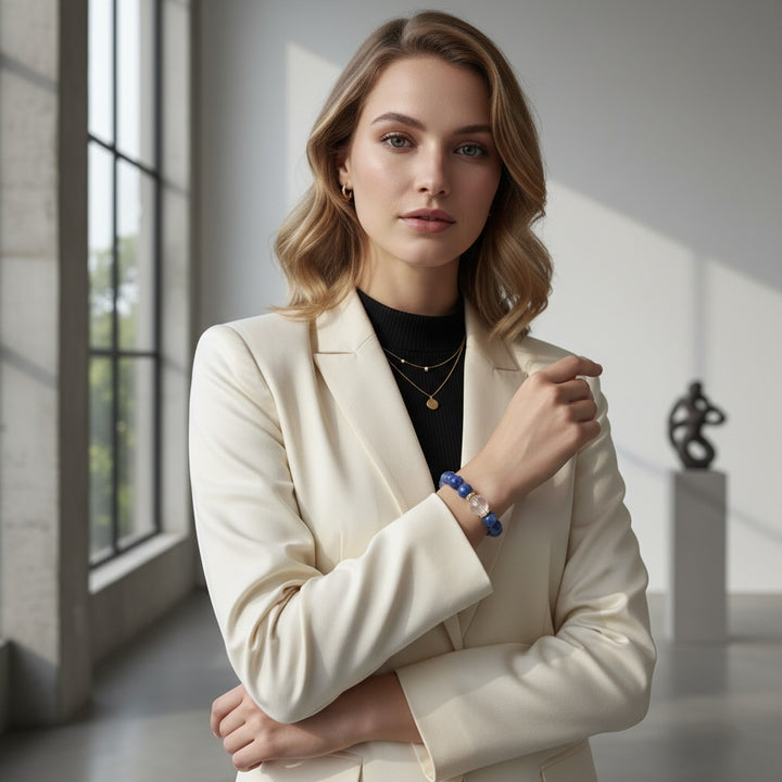 The interspersed golden bead accents not only elevate the overall sense of luxury but also symbolize wealth and success, complementing the energies of Kyanite and Clear Quartz to attract positive energy and good fortune to the wearer. By wearing this bracelet, you will feel a gentle yet powerful energy flow, helping you navigate communication effortlessly, sharpen your intuition, and ultimately achieve physical and spiritual harmony and growth.