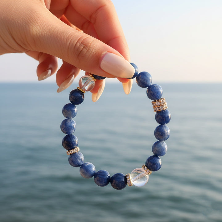 This "Oceanic Whispers" energy bracelet artfully combines the deep blue luminescence of natural Kyanite with the pure transparency of Clear Quartz, aiming to bring harmonious energy of communication, intuition, and inner balance to the wearer.