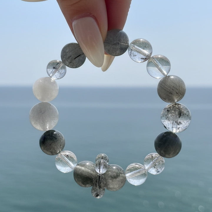 Natural Phantom White Quartz and Black Tourmalated Quartz Bracelet - Energy Balance & Enhanced Focus