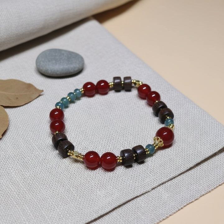 Overall Design Concept: The design of this bracelet cleverly integrates the vitality of fire (Red Agate), the stability of earth (Sandalwood), and the flow of water and communication of wind (blue-green beads), creating a microcosm of elemental balance. Wearing it means adorning oneself with these powerful natural energies, helping you maintain inner peace, stimulate inner vitality, and receive invisible protection in a bustling world. It encourages wearers to bravely face challenges while maintaining gentleness and wisdom.