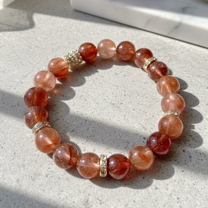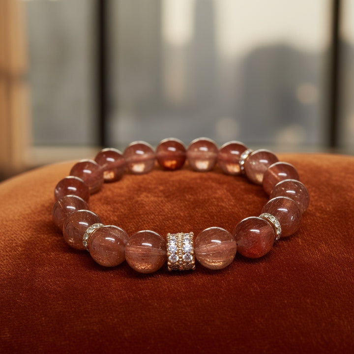 Wearing this Red Phantom Quartz bracelet, you will feel a stable and abundant flow of red energy. It helps you become more driven and persistent in your work and career, overcome challenges, and seize opportunities. It not only aids in improving personal focus and decision-making but also attracts benefactors and expands your network, leading to breakthroughs in wealth accumulation and career advancement. The exquisite diamond-studded spacer beads adorning the bracelet not only add a sense of fashion and luxury to the overall design but also symbolize the brilliance of wisdom and success, further concentrating and amplifying the potent energy of Red Phantom Quartz. It acts like an invisible mentor, guiding you towards higher achievements in your professional journey and attracting a continuous flow of wealth and good fortune.