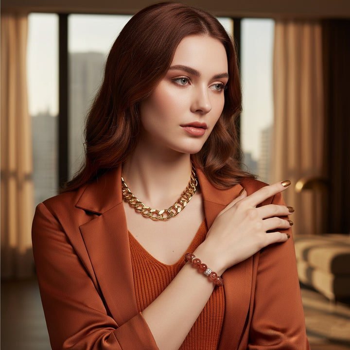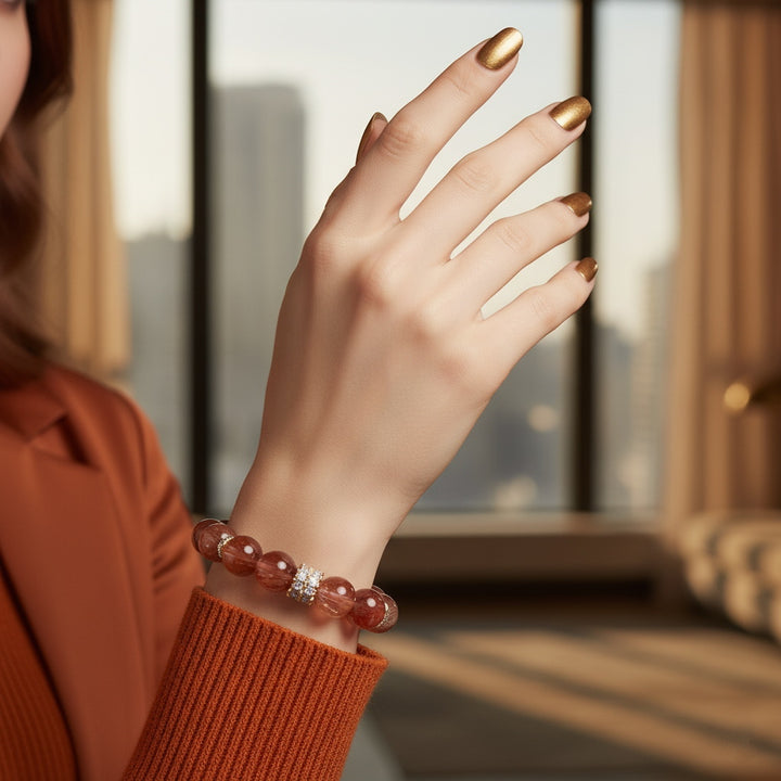 In terms of design, we focus on integrating the natural beauty of the crystal with wearing comfort. The smooth, rounded beads of the Red Phantom Quartz bracelet are carefully polished, offering a warm touch that symbolizes completeness and smoothness. Exquisite diamond-studded spacer beads are cleverly interspersed, not only enhancing the overall fashion appeal and luxury but also imbued with the symbolic meaning of gathering light and amplifying energy. These sparkling elements, like lighthouses guiding to success, boost the positive magnetic field of Red Phantom Quartz in attracting wealth, promoting career growth, and enhancing executive ability. We believe that wearing this energy crystal bracelet will not only showcase your unique taste but also help you overcome challenges in your career, achieve steady advancement, and attract continuous wealth and opportunities. Let this red blessing from the depths of the earth become a powerful aid for your career transformation and wealth accumulation.