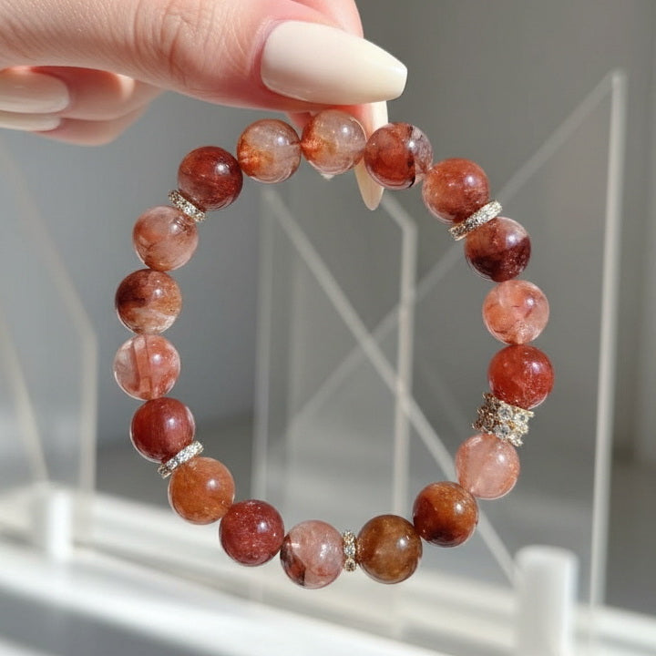 This uniquely captivating bracelet centers on natural Red Phantom Quartz, with each bead encasing distinctive red mineral inclusions that resemble petals or clouds, creating a magnificent visual. Red Phantom Quartz, also known as Phantom Quartz, gets its name from the "phantom" structures formed internally by red minerals, and is regarded as a powerful crystal for attracting wealth and boosting career success. In metaphysical energy work, Red Phantom Quartz primarily corresponds to the Root Chakra, helping to stabilize emotions, enhance drive and execution, and stimulate one's wealth consciousness and creativity.