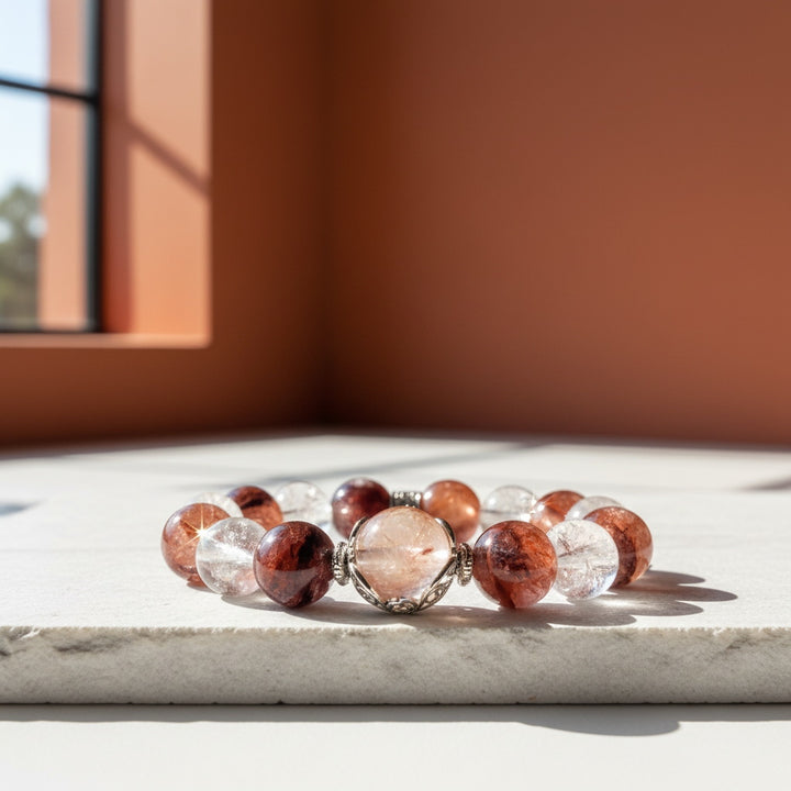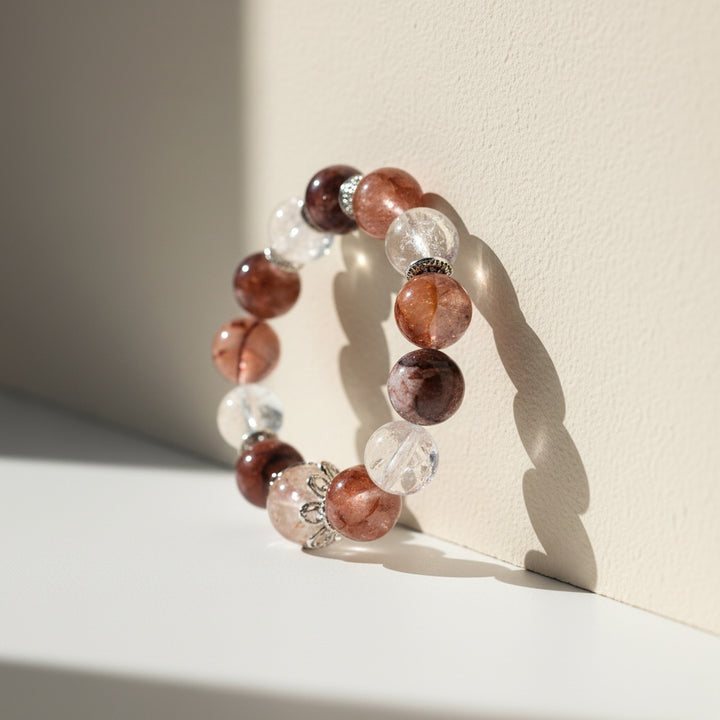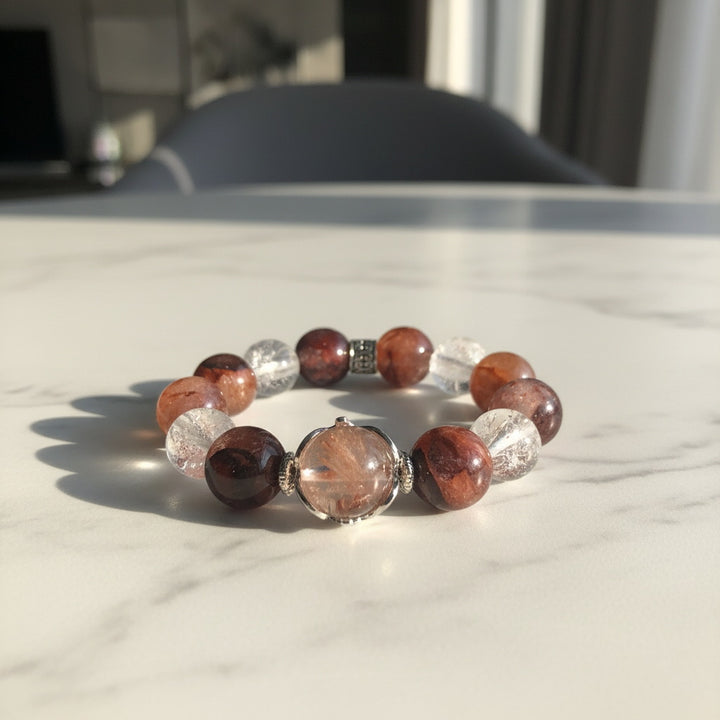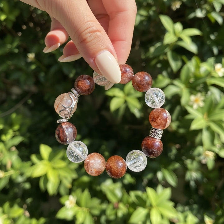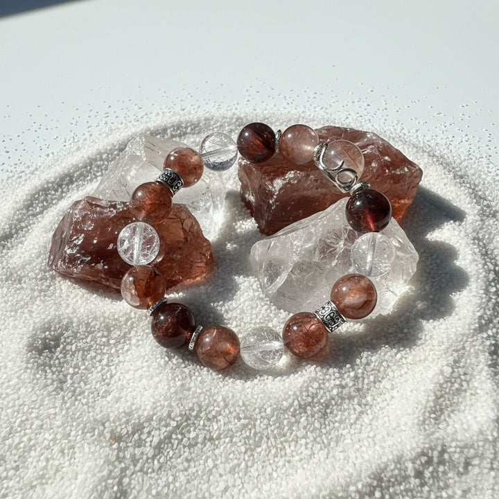 This bracelet intricately blends the unique energies of natural Red Phantom Quartz and Strawberry Quartz. Red Phantom Quartz, with its picturesque red mineral inclusions, is considered a convergence of deep earth energies, symbolizing vitality, passion, and the courage to overcome challenges. It is believed to ignite the wearer's inner drive, enhance executive power, and bring career breakthroughs and wealth accumulation.
