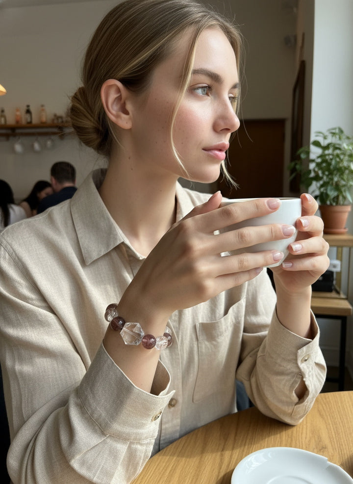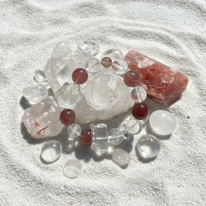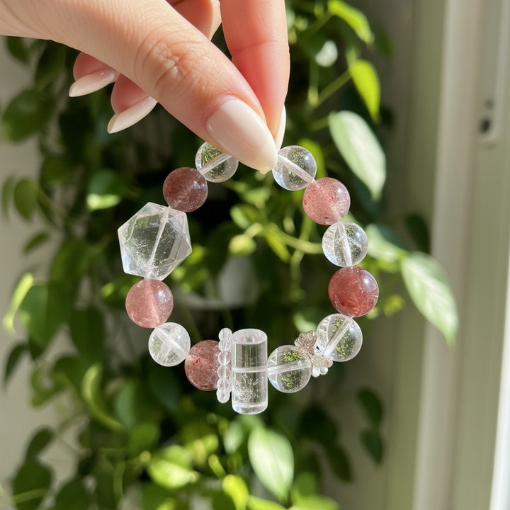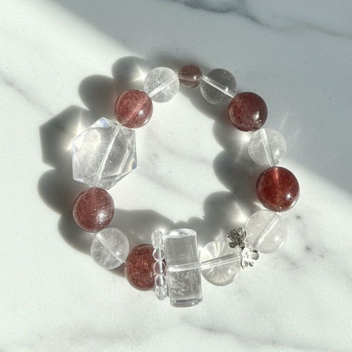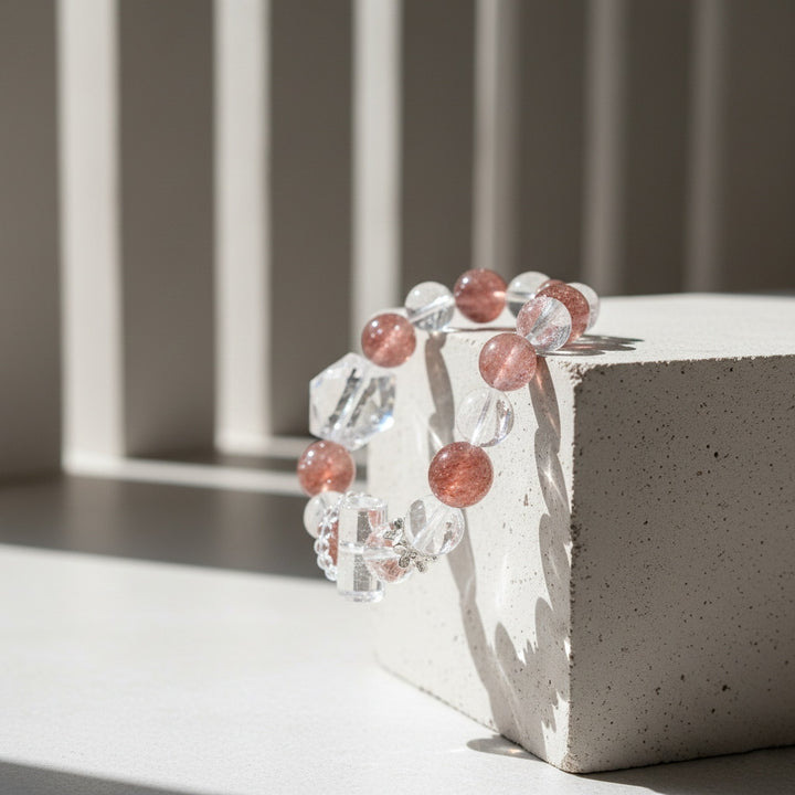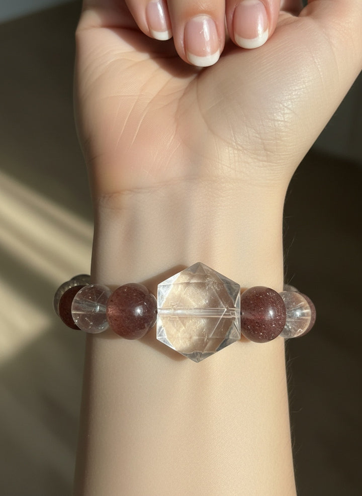 Inspired by the "Harmony of the Heart," the bracelet's design aims to connect the wearer's heart chakra and crown chakra energies. The smooth Strawberry Quartz beads symbolize gentle love and abundant relationships, renowned as a representative Love Bracelet, especially helpful for attracting love and enhancing relationships, making your emotional life sweeter and smoother. The clear and translucent White Crystal beads, particularly a few unique geometric cut beads, not only enhance the overall modern feel and visual layering but also signify the convergence of wisdom and the amplification of energy. White Crystal is a powerful source of energy purification, helping you to boost focus, assist career development, and bring peace to body and mind.