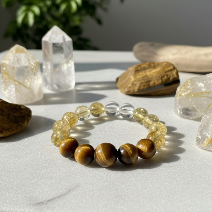 This bracelet features a carefully selected trio of high-vibrational natural crystals: Tiger's Eye, Rutilated Quartz, and Clear Quartz.
