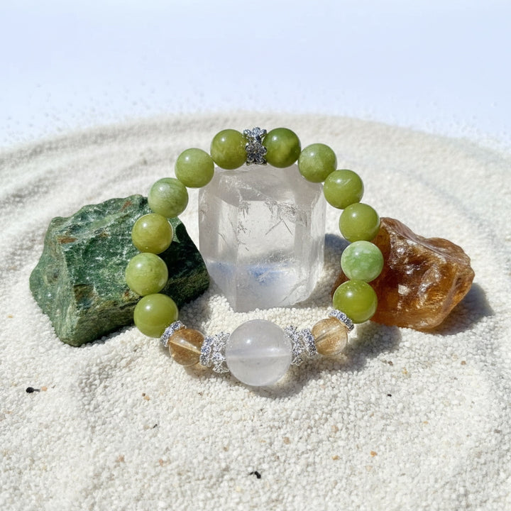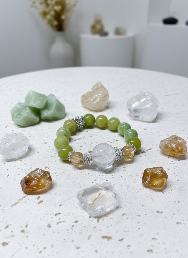 Natural Xiuyu Jade, Clear Quartz & Gold Rutilated Quartz Power Bracelet - Vibrancy Guardian · Wealth Resonance
