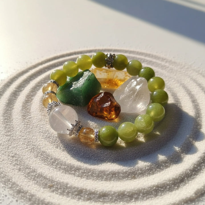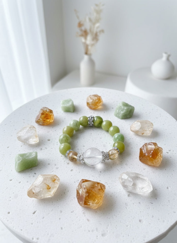 This one-of-a-kind energy bracelet is a masterpiece that perfectly blends ancient wisdom with modern aesthetics. We understand that you are not just looking for an accessory, but a natural crystal energy companion that brings positive influence. This crystal bracelet is meticulously crafted with three renowned gemstones: the gentle natural Xiuyu Jade, the clear Clear Quartz, and the vibrant Gold Rutilated Quartz.