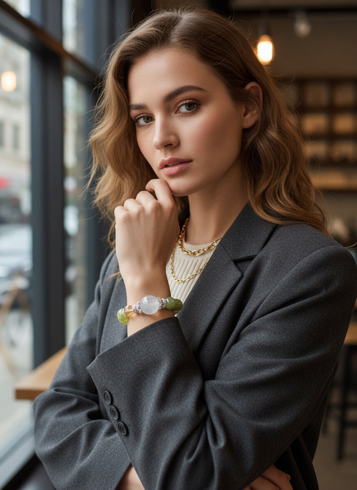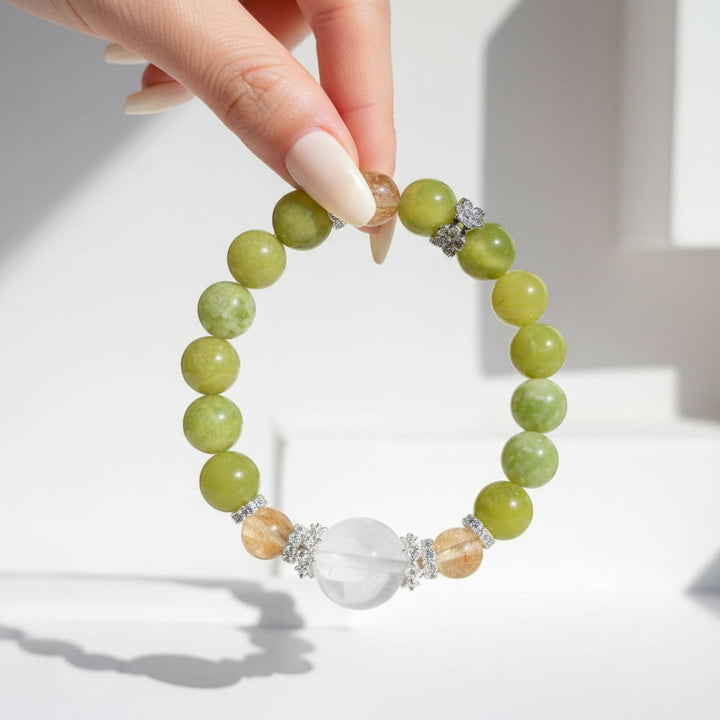 This exquisite bracelet, with its unique material combination and design philosophy, aims to bring profound metaphysical energy benefits to its wearer. The main body features natural Xiuyu Jade, one of China's Four Famous Jades, renowned for its delicate, warm texture and rich green hues. Xiuyu Jade is believed to possess powerful life energy, capable of bringing vitality, purifying the mind, warding off evil, and ensuring safety. It also helps the wearer boost energy, alleviate fatigue, and promote physical and mental harmony and health. The clear central Clear Quartz, known as the "master healer," possesses powerful purifying, balancing, and amplifying properties. It clears negative energy, enhances spiritual insight, and resonates with surrounding energies, helping the wearer achieve mental clarity and decisive judgment. Flanking it are Gold Rutilated Quartz beads, containing unique golden needle-like inclusions, symbolizing the attraction of wealth and opportunities. Revered as the "stone of wealth," it stimulates personal potential, boosts confidence, and accelerates the manifestation of desires. The overall design cleverly integrates the energies of these natural crystals, creating a powerful energy field that not only attracts prosperity and safeguards the wearer's peace and health but also balances body and mind, elevating overall fortune and aiding breakthroughs and growth in career and life.