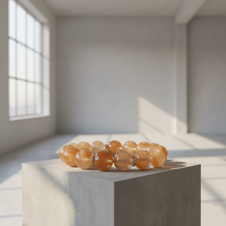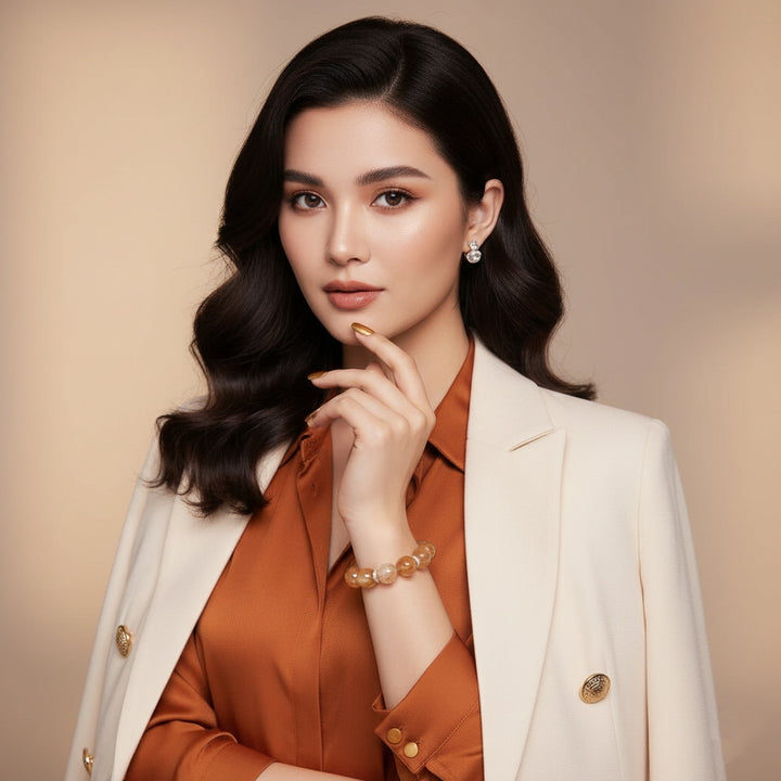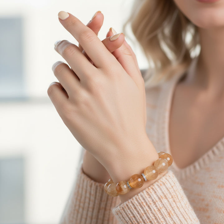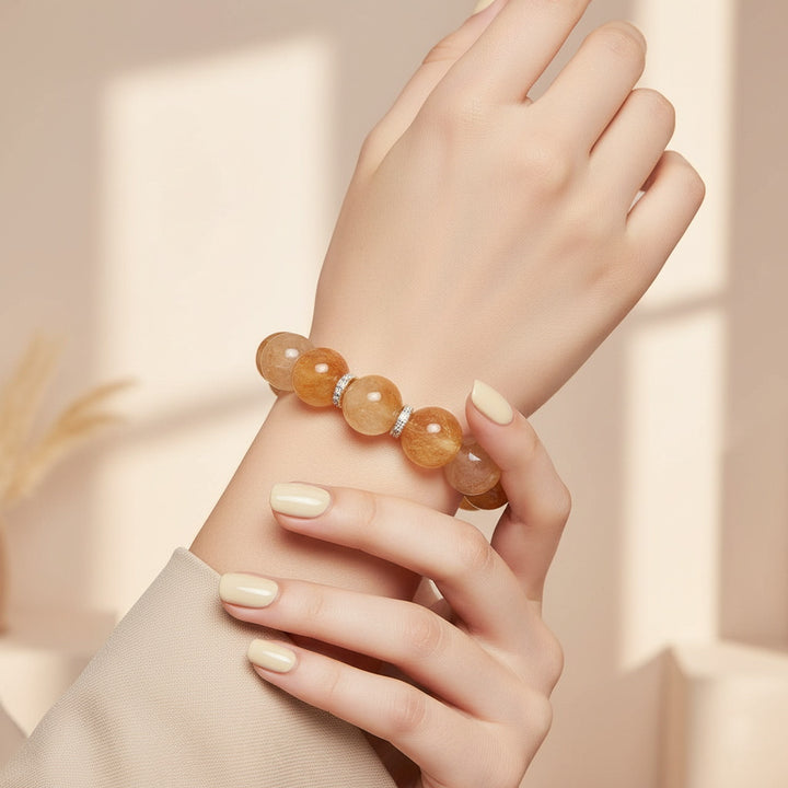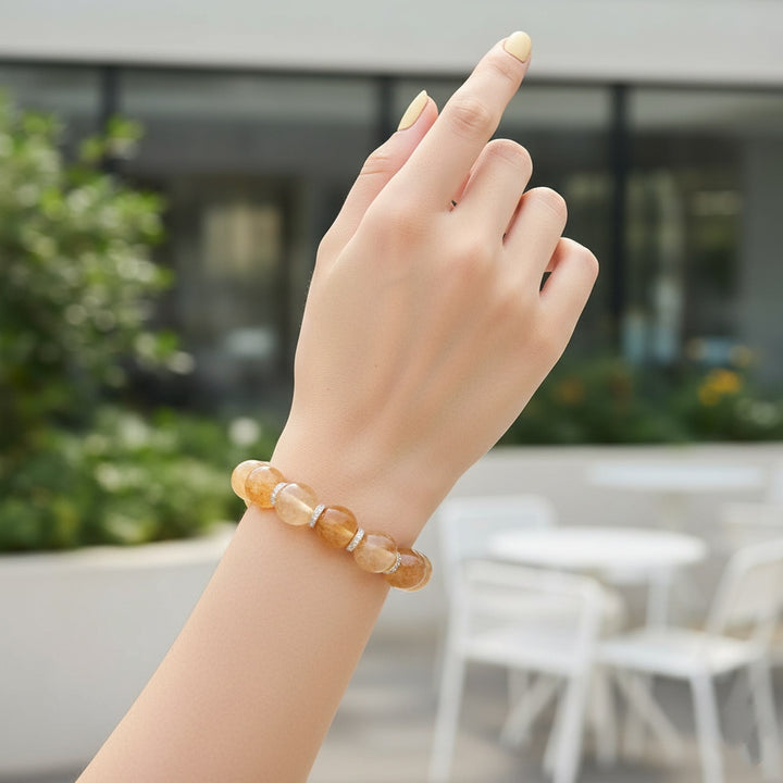 This Yellow Garden Quartz bracelet features carefully selected natural Yellow Garden Quartz beads with rich, evenly distributed golden-yellow inclusions. We ensure that each bead is meticulously polished for a smooth, warm feel and natural luster. The "garden" formations within the beads are diverse, with each bead representing a unique microcosm, which is precisely the charm of natural crystal jewelry. In its design, we incorporated delicate, sparkling spacer beads. These beads not only add a touch of modern luxury and sophistication to the bracelet but also symbolize illuminating every wonderful moment in life while harnessing the energy of this good luck crystal.