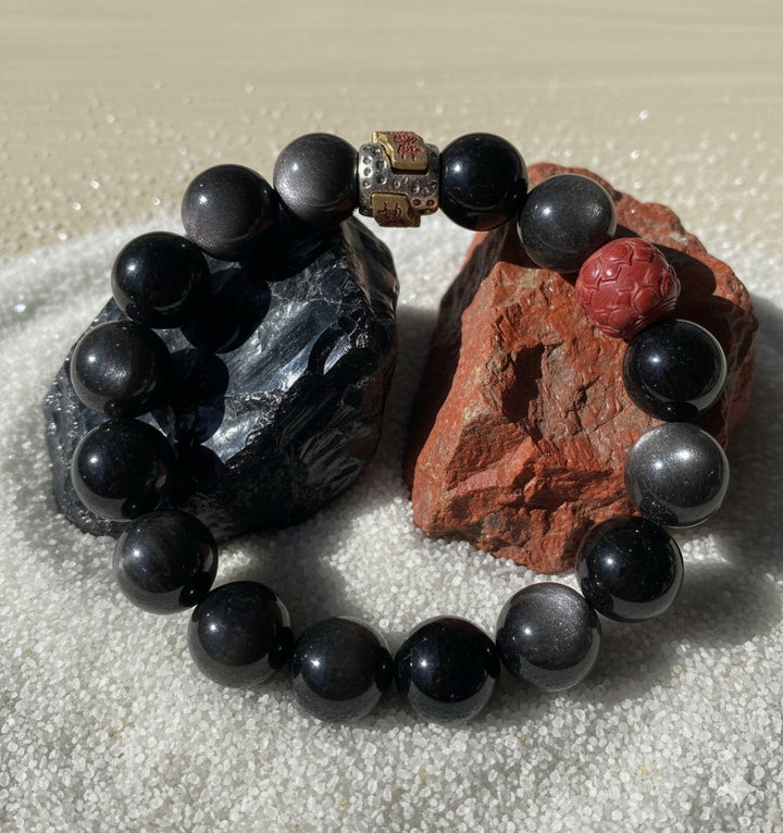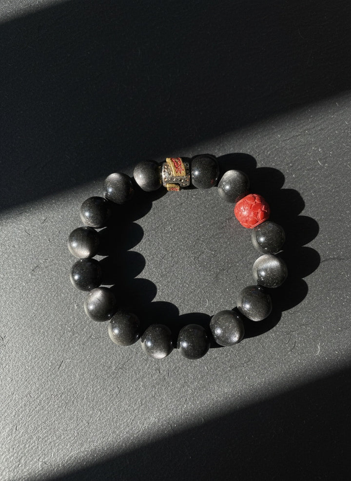 This bracelet features deep, introspective obsidian beads, ingeniously set with a vibrant cinnabar bead and a carved bead embodying Taoist wisdom—a spiritual talisman. Its design is deeply rooted in the essence of traditional Chinese culture and Taoist metaphysics.