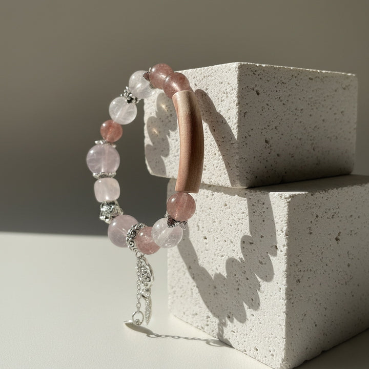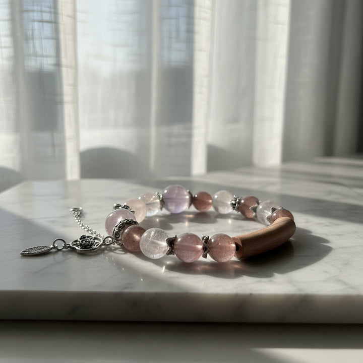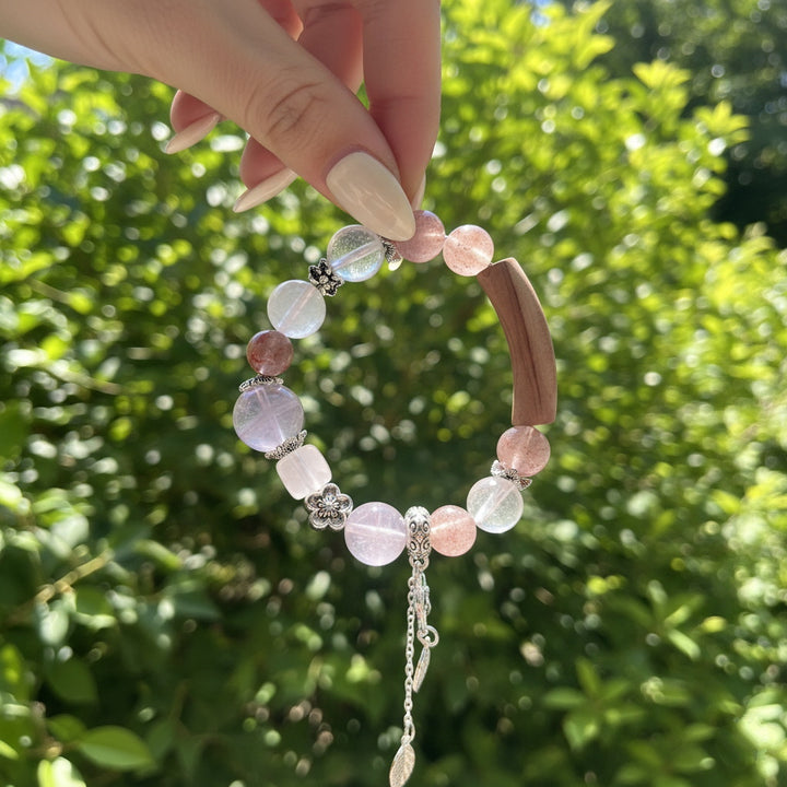Overall Design & Energy Synergy: This bracelet cleverly merges the energies of these three crystals. Pink Quartz offers tender love and healing, Strawberry Quartz ignites passion and charm, while Clear Quartz purifies and amplifies the overall positive energy. The wooden or metallic accents, as seen in the image, may also serve to stabilize energies or enhance grounding. By wearing it, you will experience emotional balance, attraction of love, improved relationships, and an uplifted overall energy field, helping you shine brightly and attract good fortune in your daily life.