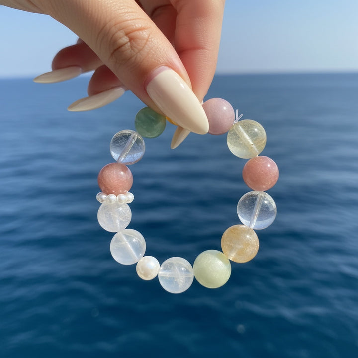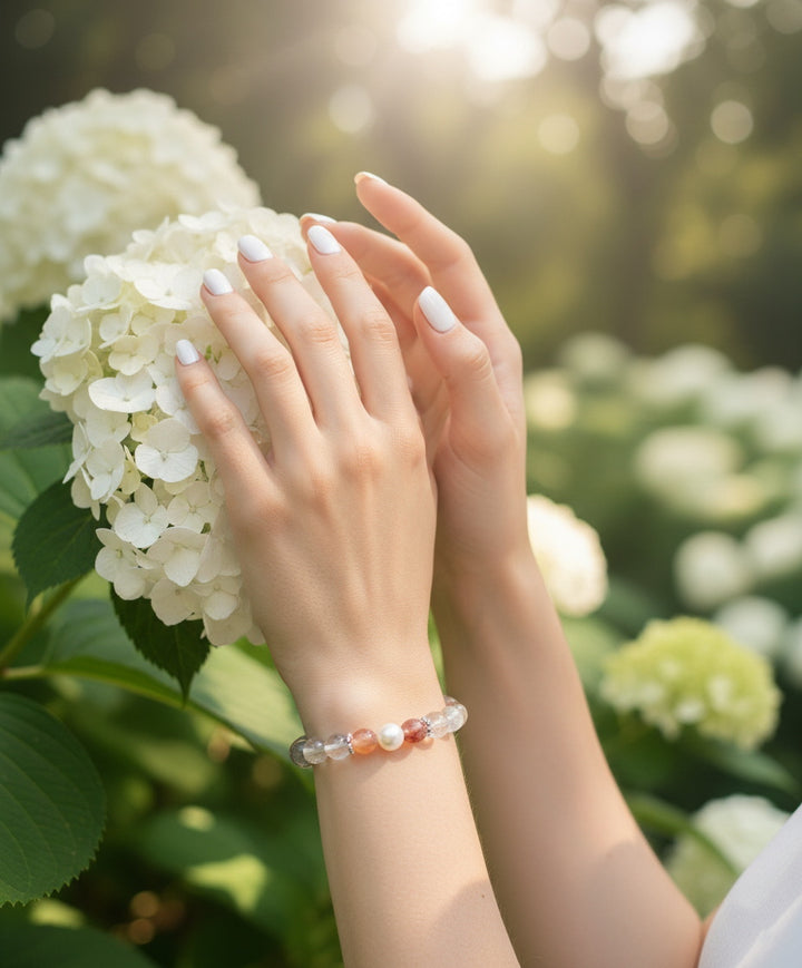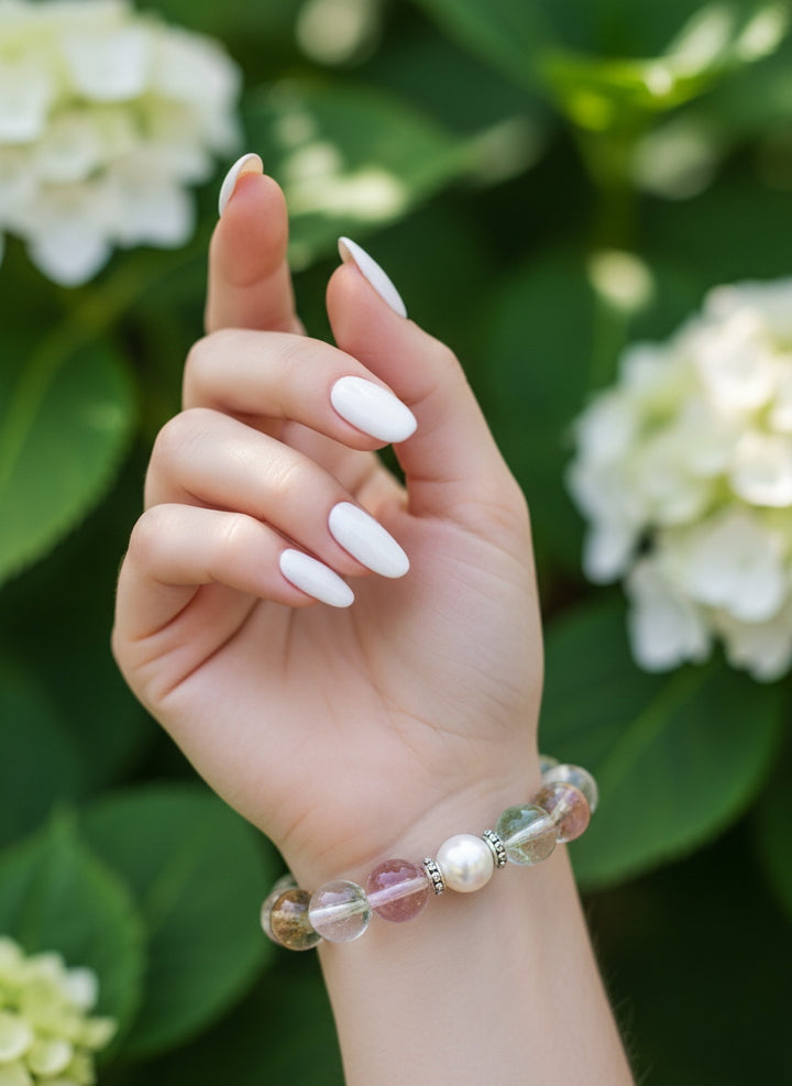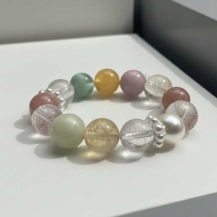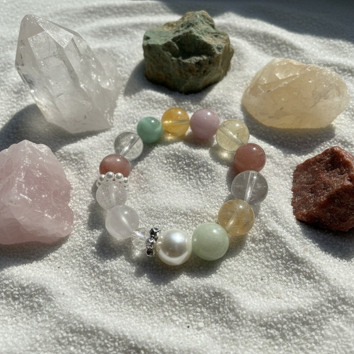 Materials & Benefits: The bracelet incorporates Strawberry Quartz for enhancing relationships and love luck, gentle Kunzite for emotional balance, powerful cleansing and amplifying Clear Quartz, and wealth-attracting, successful Citrine. Additionally, there are Green Phantom Quartz for career development and wealth accumulation, and Moonstone for intuition and gentle energy. Each energy crystal bead is meticulously polished to a smooth, round finish, offering a gentle touch. The delicate sterling silver accents and a brilliant pearl further enhance the bracelet's sophistication and unique charm.