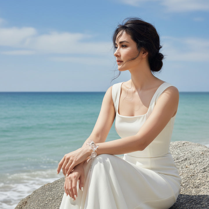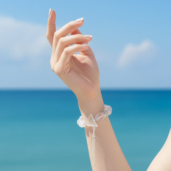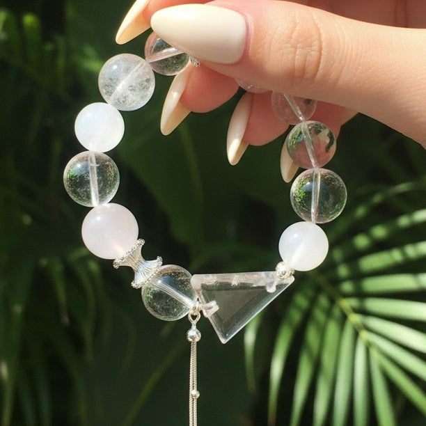 One of the design highlights is the cleverly integrated geometric crystal pendant within the bracelet. This unique three-dimensional structure is not merely a visual focal point for a fashion bracelet; it symbolizes the convergence and diffusion of cosmic energy, acting like a miniature energy tower that continuously channels positive energy to the wearer. Paired with delicate silver bead bracelet accents, the overall design aligns with the aesthetic of modern women's jewelry while retaining a touch of classical elegance. The tassel design at the end adds a playful touch and comfort.