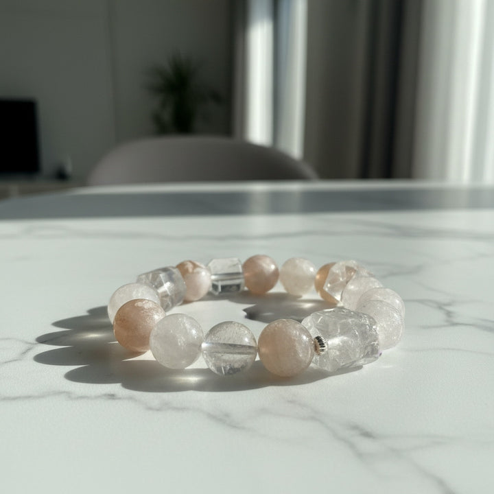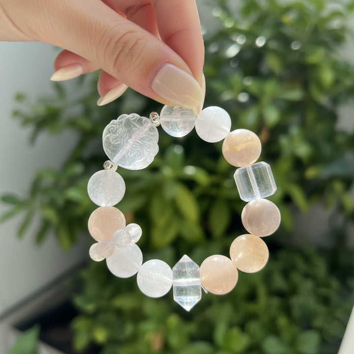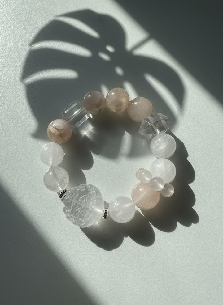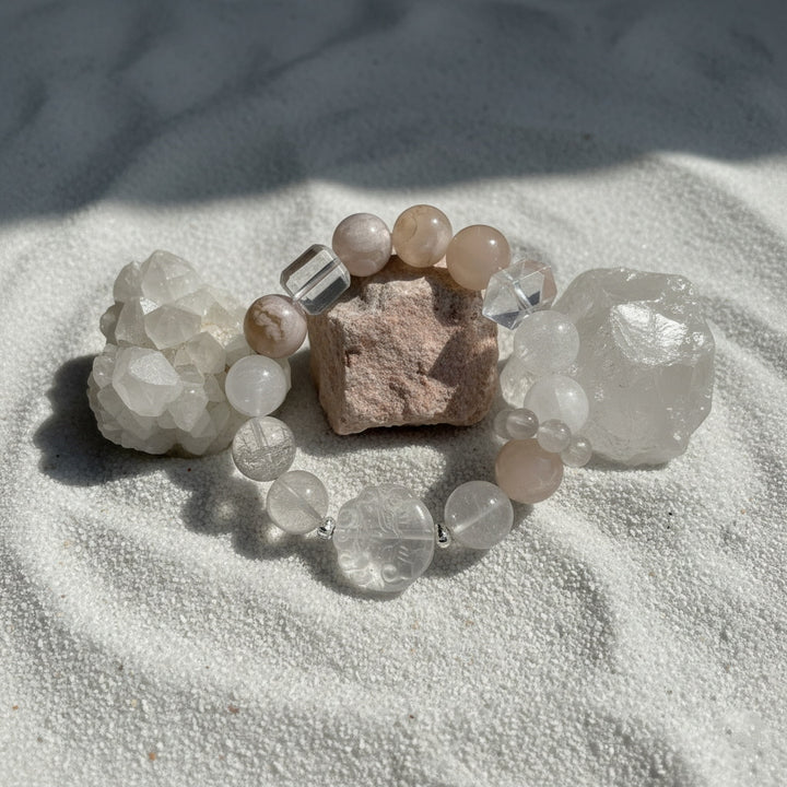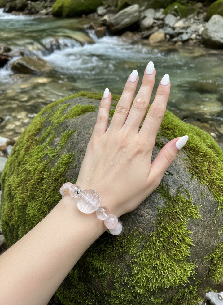 From the outset of its design, we adhered to the concept of "healing crystal and energy balance." We carefully selected four highly effective natural crystals: the gentle rose quartz bracelet symbolizes unconditional love and emotional healing, helping the wearer open their heart chakra and attract love and friendship. The sparkling strawberry quartz bracelet is responsible for enhancing personal charm and boosting confidence, considered a luck-attracting crystal for attracting good fortune and romance. The pure white phantom quartz bracelet, with its powerful purifying ability, brings clear thinking and focus to the wearer, helping to dispel negative energy, which contributes to its reputation as a prosperity bracelet. And the moonstone bracelet, emitting a soft glow, is closely linked to intuition, balancing emotions and inspiring creativity.